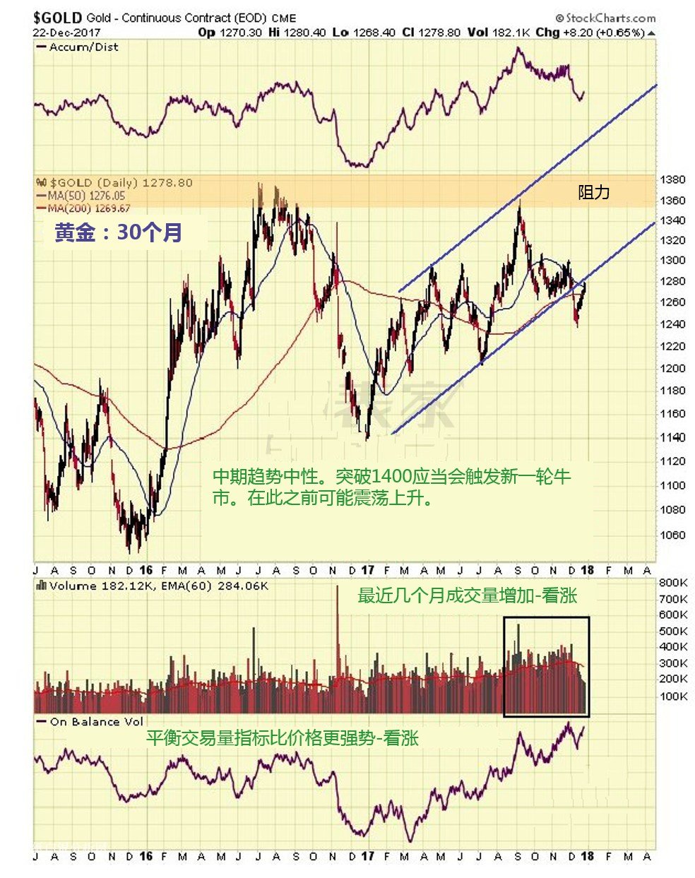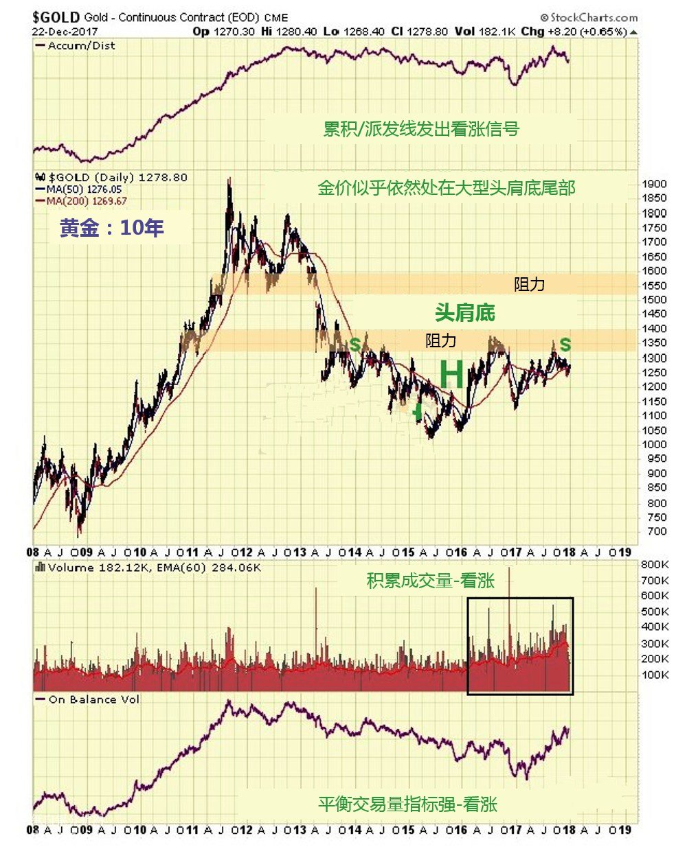技術分析師Clive Maund表示,美元技術面看跌與黃金持倉結構改善,為金價上漲鋪平道路。他認為,一旦金價突破1400,則意味著一段新牛市的開啟。 下圖為黃金10年日線走勢,價格目前處在頭肩底形態末尾,預計將現突破,這支持長期看漲的觀點。今年下半年累積的巨大交易量,以及交易量指標穩步攀升,暗示黃金在積聚動能。若價格突破1400,則將意味著大型底部的形成,價格將步入一個新的牛市階段。 下圖為黃金30個月日線走勢,價格在2015年末觸及上述頭肩底形態低點后急速走高,與黃金股表現一致,但之后在去年12月跌回頭肩底右肩低點。自此以后,價格穩步攀升,試圖擺脫整個底部形態。當前階段最好將趨勢描述為中性,直到突破價格向上突破1400。可以確信的是,突破指日可待。 下圖為黃金6個月日線走勢,本月稍早價格在跌破1260支撐后跌至200日移動均線下方,但在過去一到兩周扭轉跌勢,升向1300附近的阻力區。 ![]() 黃金6個月走勢圖 ![]() 黃金持倉 ![]() ![]() 美元指數9個月走勢圖 ![]() 查看更多紙白銀相關新聞請看:紙白銀行情新聞