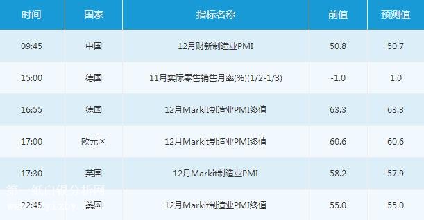 歐洲時段,投資者需關注15:00公布的德國11月實際零售銷售月率,16:55公布的德國12月Markit制造業PMI終值,以及17:30公布的英國12月Markit制造業PMI。