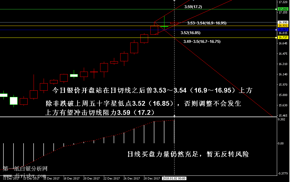 今日下方關鍵支撐位3.53~3.54(16.9~16.95)、3.49~3.5(16.7~16.75)、3.45(16.5)、3.41(16.35)、3.33~3.34(15.95~16)、3.28(15.6);今日上方關鍵阻力3.59(17.2)、3.68(17.6)。 技術僅僅是基于概率論和統計學的一種綜合分析手段,絕非預測。所以技術分析是在考慮做好止損的情況下去博取大概率事件,投資不可過于迷信技術分析。(短線操作請一定做好止損,一旦被損,代表分析師基于概率和統計的技術分析不適用于當前行情) 1、文中價格為紙白銀價格,括號內為國際銀價,投資者可雙向參考。 2、以上所有價格為工商銀行買入價,即紙白銀低價。進倉點位要再加點差(各銀行點差不一),出倉則不要。 3、第一紙白銀給出的所有建議僅供投資者參考,不作為下單絕對依據,切勿過于依賴。 4、北京時間09:11發布此文章。 5、上一交易日白銀價格分析情況:(1月1日)白銀本周將繼續拉升 元旦假期今日休市