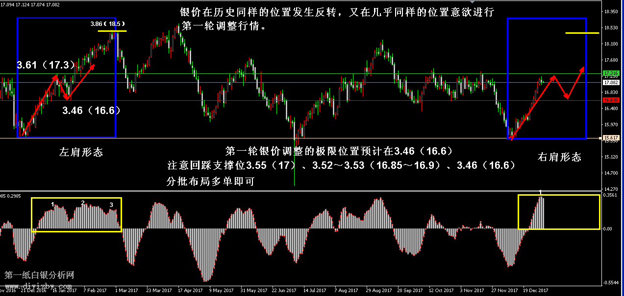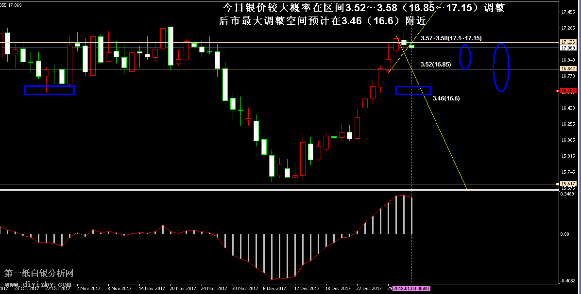 今日下方關鍵支撐位3.55(17)、3.52~3.53(16.85~16.95)、3.46(16.6)、3.42(16.4)、3.33(16)、3.28(15.6);今日上方關鍵阻力3.57~3.58(17.1~17.15)、3.6(17.25)、3.67(17.6)。 技術僅僅是基于概率論和統計學的一種綜合分析手段,絕非預測。所以技術分析是在考慮做好止損的情況下去博取大概率事件,投資不可過于迷信技術分析。(短線操作請一定做好止損,一旦被損,代表分析師基于概率和統計的技術分析不適用于當前行情) 1、文中價格為紙白銀價格,括號內為國際銀價,投資者可雙向參考。 2、以上所有價格為工商銀行買入價,即紙白銀低價。進倉點位要再加點差(各銀行點差不一),出倉則不要。 3、第一紙白銀給出的所有建議僅供投資者參考,不作為下單絕對依據,切勿過于依賴。 4、北京時間08:50發布此文章。 5、上一交易日白銀價格分析情況:(1月3日)白銀仍具上升動能和空間 回踩支撐積極買入