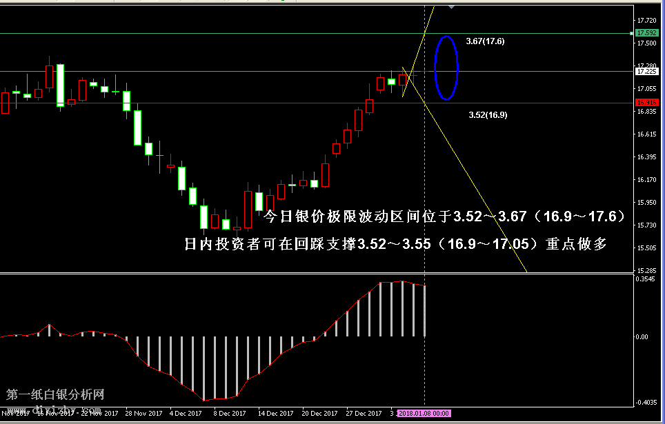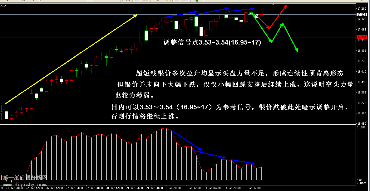 今日下方關鍵支撐位3.55(17)、3.52~3.53(16.85~16.95)、3.46(16.6)、3.42(16.4)、3.33(16)、3.28(15.6);今日上方關鍵阻力3.57~3.58(17.1~17.15)、3.6(17.25)、3.67(17.6)。 技術僅僅是基于概率論和統計學的一種綜合分析手段,絕非預測。所以技術分析是在考慮做好止損的情況下去博取大概率事件,投資不可過于迷信技術分析。(短線操作請一定做好止損,一旦被損,代表分析師基于概率和統計的技術分析不適用于當前行情) 1、文中價格為紙白銀價格,括號內為國際銀價,投資者可雙向參考。 2、以上所有價格為工商銀行買入價,即紙白銀低價。進倉點位要再加點差(各銀行點差不一),出倉則不要。 3、第一紙白銀給出的所有建議僅供投資者參考,不作為下單絕對依據,切勿過于依賴。 4、北京時間08:50發布此文章。 5、上一交易日白銀價格分析情況:(1月5日)白銀仍處于極端上漲格局 非農難改變大趨勢