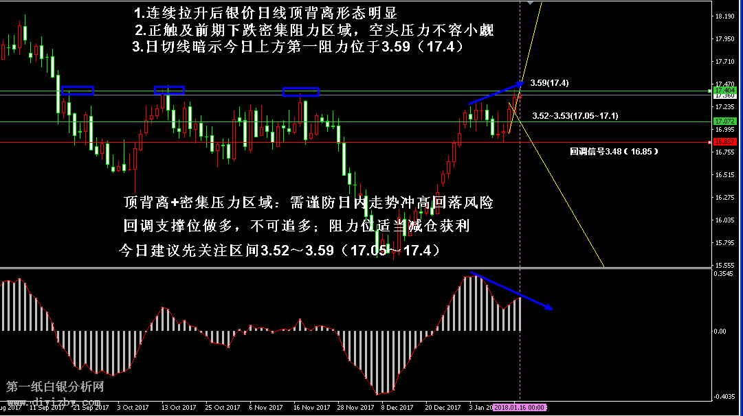 今日下方關(guān)鍵支撐位3.52~3.53(17.05~17.1)、3.43(16.6)、3.41(16.45)、3.36(16.25)、3.31(16)、3.22(15.6);今日上方關(guān)鍵阻力3.59(17.4)、3.64(17.6)。 技術(shù)僅僅是基于概率論和統(tǒng)計(jì)學(xué)的一種綜合分析手段,絕非預(yù)測(cè)。所以技術(shù)分析是在考慮做好止損的情況下去博取大概率事件,投資不可過于迷信技術(shù)分析。(短線操作請(qǐng)一定做好止損,一旦被損,代表分析師基于概率和統(tǒng)計(jì)的技術(shù)分析不適用于當(dāng)前行情) 1、文中價(jià)格為紙白銀價(jià)格,括號(hào)內(nèi)為國際銀價(jià),投資者可雙向參考。 2、以上所有價(jià)格為工商銀行買入價(jià),即紙白銀低價(jià)。進(jìn)倉點(diǎn)位要再加點(diǎn)差(各銀行點(diǎn)差不一),出倉則不要。 3、第一紙白銀給出的所有建議僅供投資者參考,不作為下單絕對(duì)依據(jù),切勿過于依賴。 4、北京時(shí)間09:00發(fā)布此文章。 5、上一交易日白銀價(jià)格分析情況:(1月15日)白銀有望延續(xù)拉升 守穩(wěn)信號(hào)點(diǎn)將持續(xù)看漲