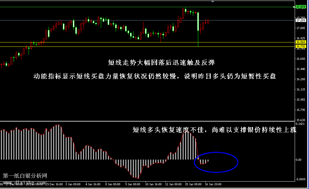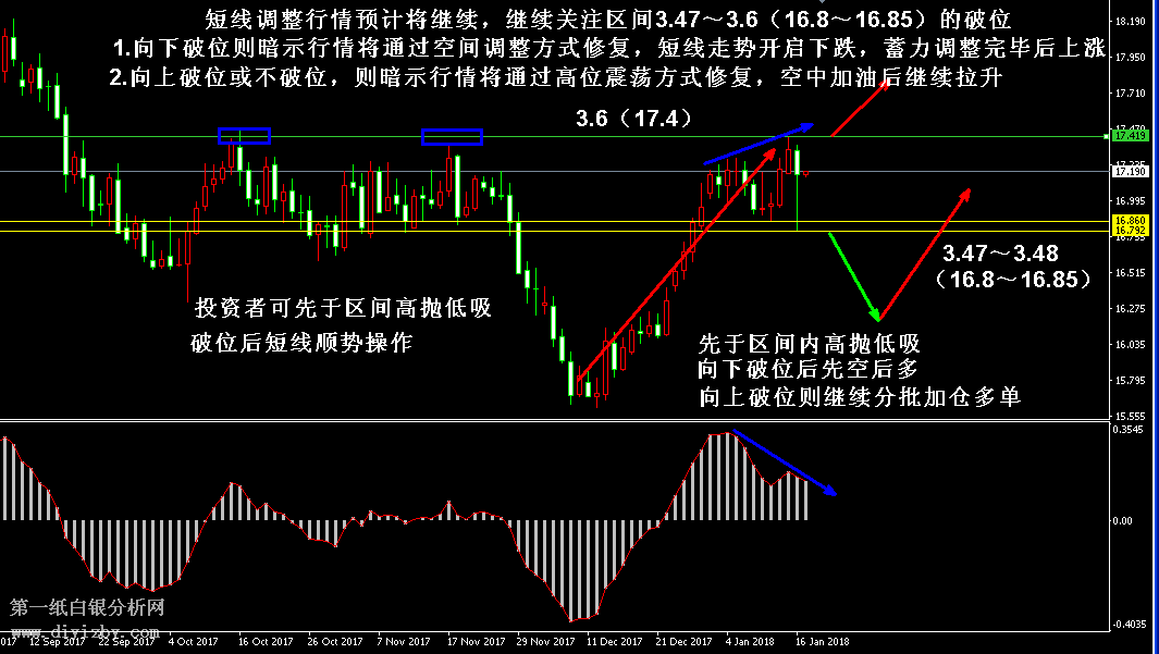今日下方關鍵支撐位3.48~3.49(16.85~16.9)、3.41(16.5)、3.37(16.3)、3.31(16)、3.22(15.6);今日上方關鍵阻力3.6(17.4)、3.64(17.6)、3.72(18)。 技術僅僅是基于概率論和統計學的一種綜合分析手段,絕非預測。所以技術分析是在考慮做好止損的情況下去博取大概率事件,投資不可過于迷信技術分析。(短線操作請一定做好止損,一旦被損,代表分析師基于概率和統計的技術分析不適用于當前行情) 1、文中價格為紙白銀價格,括號內為國際銀價,投資者可雙向參考。 2、以上所有價格為工商銀行買入價,即紙白銀低價。進倉點位要再加點差(各銀行點差不一),出倉則不要。 3、第一紙白銀給出的所有建議僅供投資者參考,不作為下單絕對依據,切勿過于依賴。 4、北京時間08:10發布此文章。 5、上一交易日白銀價格分析情況:(1月16日)白銀觸及密集阻力 頂背離下謹防沖高回落