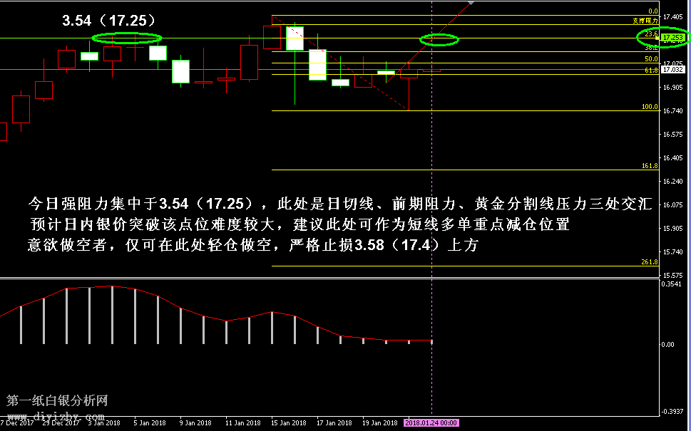 今日下方關鍵支撐位3.45(16.8)、3.41(16.6)、3.35(16.3)、3.29(16)、3.21(15.6);今日上方關鍵阻力3.55(17.25)、3.58(17.4)、3.63(17.6)、3.71(18)。 提示:技術僅僅是基于概率論和統計學的一種綜合分析手段,絕非預測。所以技術分析是在考慮做好止損的情況下去博取大概率事件,投資不可過于迷信技術分析。(短線操作請一定做好止損,一旦被損,代表分析師基于概率和統計的技術分析不適用于當前行情) 另外,由于紙白銀價格是國際銀價換算而來,而換算過程中涉及到人民幣對美元匯率的變化,即使在國際銀價不變化的情況下,如果人民幣貶值或升值,也會導致紙白銀價格出現變動。因此,我們的分析只采用最新的國際銀價對應的人民幣白銀價格,如與過去分析價格有出入, 投資者應知曉其原因。 1、文中價格為紙白銀價格,括號內為國際銀價,投資者可雙向參考。 2、以上所有價格為工商銀行買入價,即紙白銀低價。進倉點位要再加點差(各銀行點差不一),出倉則不要。 3、第一紙白銀給出的所有建議僅供投資者參考,不作為下單絕對依據,切勿過于依賴。 4、北京時間08:45發布此文章。 5、上一交易日白銀價格分析情況:(1月23日)白銀持續震蕩中 蓄勢待發醞釀新一輪上漲