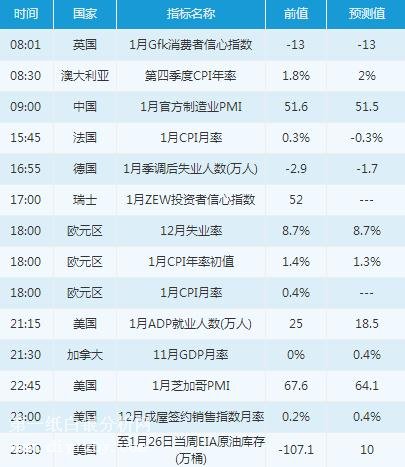 周三(1月31日)亞洲時段投資者需關注08:01公布的英國1月Gfk消費者信心指數、08:30澳大利亞第四季度CPI年率及09:00中國1月官方制造業PMI。歐洲時段,投資者需關注15:45法國1月CPI月率、16:55德國 1月季調后失業人數,以及18:00歐元區12月失業率、歐元區1月CPI年率初值、歐元區1月CPI月率。