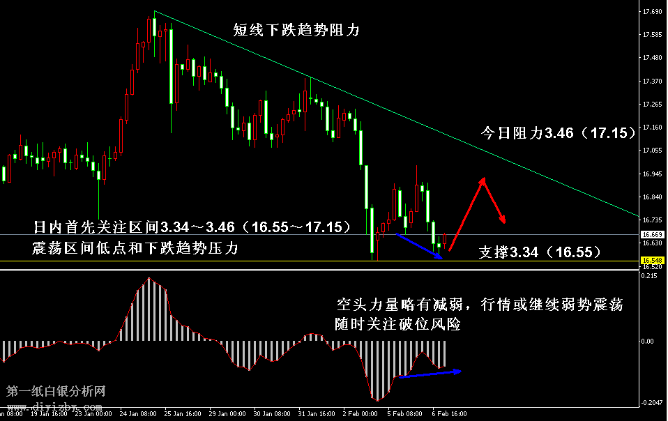 今日下方關鍵支撐位3.34(16.55)、3.31(16.4)、3.25(16.1);今日上方關鍵阻力3.44(17.05)、3.46(17.15)、3.52(17.4)。 提示:技術僅僅是基于概率論和統計學的一種綜合分析手段,絕非預測。所以技術分析是在考慮做好止損的情況下去博取大概率事件,投資不可過于迷信技術分析。(短線操作請一定做好止損,一旦被損,代表分析師基于概率和統計的技術分析不適用于當前行情) 另外,由于紙白銀價格是國際銀價換算而來,而換算過程中涉及到人民幣對美元匯率的變化,即使在國際銀價不變化的情況下,如果人民幣貶值或升值,也會導致紙白銀價格出現變動。因此,我們的分析只采用最新的國際銀價對應的人民幣白銀價格,如與過去分析價格有出入, 投資者應知曉其原因。 1、文中價格為紙白銀價格,括號內為國際銀價,投資者可雙向參考。 2、以上所有價格為工商銀行買入價,即紙白銀低價。進倉點位要再加點差(各銀行點差不一),出倉則不要。 3、第一紙白銀給出的所有建議僅供投資者參考,不作為下單絕對依據,切勿過于依賴。 4、北京時間08:59發布此文章。 5、上一交易日白銀價格分析情況:(2月6日)白銀驗證支撐轉入震蕩 后市將迎方向選擇