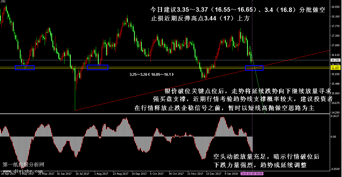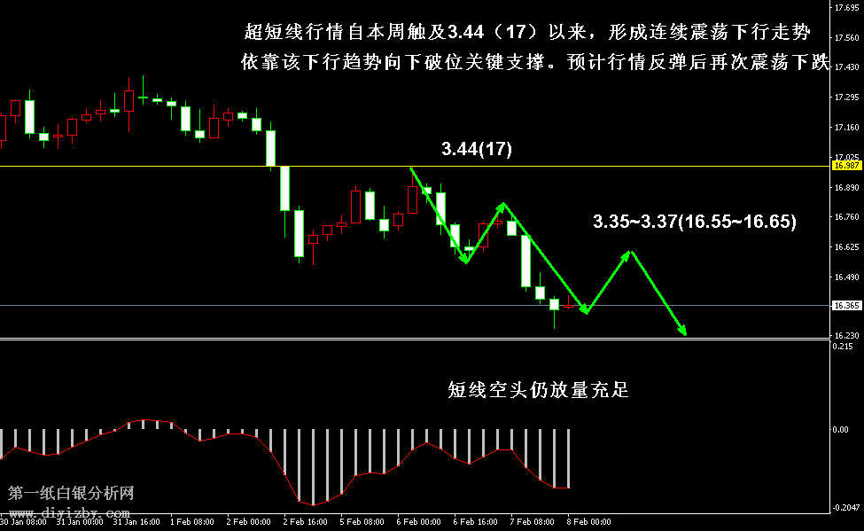今日下方關(guān)鍵支撐位3.25~3.26(16.05~16.1)、3.19(15.8)、3.16(15.6);今日上方關(guān)鍵阻力3.35(16.55)、3.37(16.65)、3.4(16.8)、3.44(17)。 提示:技術(shù)僅僅是基于概率論和統(tǒng)計(jì)學(xué)的一種綜合分析手段,絕非預(yù)測。所以技術(shù)分析是在考慮做好止損的情況下去博取大概率事件,投資不可過于迷信技術(shù)分析。(短線操作請一定做好止損,一旦被損,代表分析師基于概率和統(tǒng)計(jì)的技術(shù)分析不適用于當(dāng)前行情) 另外,由于紙白銀價(jià)格是國際銀價(jià)換算而來,而換算過程中涉及到人民幣對美元匯率的變化,即使在國際銀價(jià)不變化的情況下,如果人民幣貶值或升值,也會(huì)導(dǎo)致紙白銀價(jià)格出現(xiàn)變動(dòng)。因此,我們的分析只采用最新的國際銀價(jià)對應(yīng)的人民幣白銀價(jià)格,如與過去分析價(jià)格有出入, 投資者應(yīng)知曉其原因。 1、文中價(jià)格為紙白銀價(jià)格,括號內(nèi)為國際銀價(jià),投資者可雙向參考。 2、以上所有價(jià)格為工商銀行買入價(jià),即紙白銀低價(jià)。進(jìn)倉點(diǎn)位要再加點(diǎn)差(各銀行點(diǎn)差不一),出倉則不要。 3、第一紙白銀給出的所有建議僅供投資者參考,不作為下單絕對依據(jù),切勿過于依賴。 4、北京時(shí)間08:53發(fā)布此文章。 5、上一交易日白銀價(jià)格分析情況:(2月7日)白銀仍守穩(wěn)關(guān)鍵支撐 區(qū)間破位前弱勢震蕩