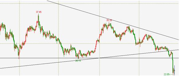 就技術面而言,白銀在前交易時段的走勢是在暴跌之后較為典型的震蕩走勢,市場在反彈稍有停歇之后,原有的空方趨勢和市場情緒再度出現,盤中一度下跌3%以上就是這種市場心態的反應,但是這種下跌在接近前期低點的附近再度被市場拉起,這樣的走勢也說明了市場的短線承接能力在逐漸的增強,當然這種短線的承接能力增強在很大程度上是基于黃金的相對穩定的走勢,就目前小周期看,白銀短線的反彈仍有繼續發揮的空間,震蕩向上的概率偏大,但是整體看目前的階段性修正仍屬于空頭態勢下的短線修正。