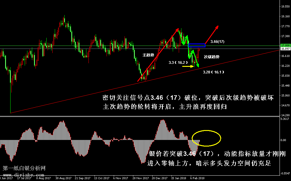 目前紙白銀價格是3.437元/克。昨日白銀價格繼續上漲,雖目前行情還未突破信號點3.46(17),但走勢強勢拉升暗示主趨勢支撐位正發生主導作用,也驗證了我們此前的說法,當次級回調趨勢遭遇主趨勢強支撐后,行情將有望向著主趨勢的方向發生改變。目前來看,銀價正朝著醞釀新一輪上漲運行,一旦近期行情完成突破3.46(17)的信號點,則前期回調趨勢將結束,并開啟新一輪拉升,投資者日內可密密切關注3.46(17)信號點的破位,在突破之前,仍不可急于追多,激進者繼續保持區間高拋低吸,破位后順勢跟進。如下圖所示為白銀日線走勢圖,從趨勢角度來看,圖中紅色箭頭顯示當前銀價的主趨勢仍處于良好的上漲形態之中,雖然1月下旬行情展開了一輪圖中綠色箭頭所示的連續下跌走勢,但該走勢并未改變主升浪上漲形態。在近期銀價逐漸靠近主趨勢強支撐3.28(16.1)附近后,多空力量開始發生轉變,過去銀價曾最低回踩至3.3(16.2)附近,此處距離主趨勢和趨勢線支撐位3.28(16.1)僅差一步之遙,在未完全回踩至強支撐之前,走勢便迎來強勢反彈,也正說明了過去一輪下跌走勢相對于主趨勢僅僅是回調行情。若結合圖中紅色箭頭和綠色箭頭形態來看,目前可將主趨勢上漲定義為進三上漲浪,而次級趨勢回調定義為退二回踩浪,大趨勢上白銀欲將維持良好的“進三退二”格局,一旦近期行情突破3.46(17)信號點,走勢將重新展開新一輪“進三”上漲,屆時銀價必然將再創新高,突破1月高點概率極大。值得注意的是,雖然本周行情漲勢可觀,但截至目前為止,行情還未完全突破信號點3.46(17),此處為圖中綠色箭頭所示下跌趨勢的最后一浪高點,只有突破該點位,才可驗證本周行情的反彈為反轉,否則若不能突破3.46(17)關口,則銀價再度回落將仍然滿足“高點低點不斷下行”的條件,換言之,若不能突破,繼續回落則仍將處于下跌趨勢范圍內運行。另外,今日趨勢線支撐位依舊位于3.28(16.1),投資者可繼續關注區間3.28~3.46(16.1~17)的突破情況,在突破之前,切勿追漲殺跌,仍然建議投資者在靠近區間兩端的支撐和阻力位輕倉高拋低吸,保守者建議觀望,突破區間后順勢跟進即可。綜合分析:順勢思路告訴我們,未來銀價向上突破的概率是極大的,但短期內走勢未完成破位之前,投資者仍需保持謹慎態度,行情存在繼續在區間3.28~3.46(16.1~17)范圍內震蕩整理的可能性,區間內輕倉高拋低吸試盤,一旦破位即可順勢跟進。另外,雖然3.46(17)距離假設底部3.28(16.1)較遠,但并不影響其作為信號點的事實,銀價若突破此處后,后市行情仍具備較強的上漲空間。從波浪理論來看,行情突破3.46(17)后,銀價新的主升浪將再創新高的概率較大;從動能指標來看,銀價若突破3.46(17)關口,則圖中黃色圈所示的動能指標才剛剛進入零軸上方,這暗示多頭力量在過去一輪回調中蓄力充足,買盤持續發力的條件成熟,行情將繼續保持上漲形態,上方空間仍然較大。因此,投資者等待信號點3.46(17)破位后才開始跟進多單,仍然是即安全又合理的策略。