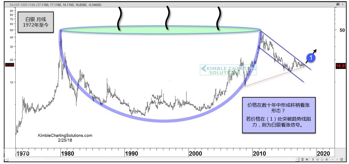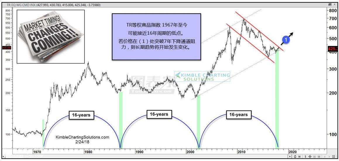 上圖為白銀在過去40年中的月線走勢,價格可能在過去數十年間形成看漲的“杯柄形態”。 目前,白銀處于7年下降通道之中,該通道可能是杯柄形態的柄部。價格正在測試通道上軌阻力,分析師Kimble認為,如果白銀在(1)處破位,則可能為看漲信號。 上圖為TR商品指數在過去40年里的走勢,價格受到16年周期的影響。目前這一周期可能即將開啟新的上升趨勢,且價格正在測試7年下降通道上軌。Kimble指出,若價格在(1)處破位,同樣也是商品的看漲信號。 綜上,Kimble指出,白銀和商品指數同時上行測試7年下降通道上軌,若兩者同時破位,則為多年罕見的看漲信號。