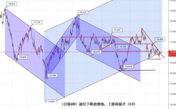 3:由此來(lái)看,美元再度面臨回落,白銀又沒(méi)有跌破前低,且如圖盤中下降趨勢(shì)線呈現(xiàn)破位的跡象,所以白銀整體走勢(shì)并不悲觀,破位下降趨勢(shì)線后多頭將展開上攻行情!
