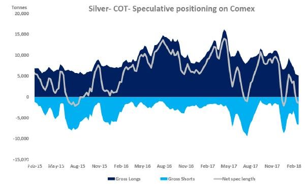 截至2月20日,凈投機頭寸為- 1491噸-比前一周減少了316噸。這是由商業多頭頭寸連續6周平倉和連續3周空頭積累共同推動的。白銀的投機頭寸被空方極度拉伸,其凈投機頭寸非常接近于2015年7月達到的-2091噸的歷史低點。