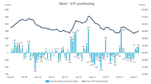 上一次ETF大規模凈流入是在2017年12月,當時ETF投資者在當月的第一周買入了306噸白銀。截止2月16日至2月23日,ETF投資者買入了約85噸白銀,這是繼2017年12月后最大規模的一次凈流入。