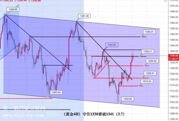 4:黃金以1366為高點的下降通道運行完整,盤中前高1341破位后多頭將進一步上攻去測試1350-57區域!