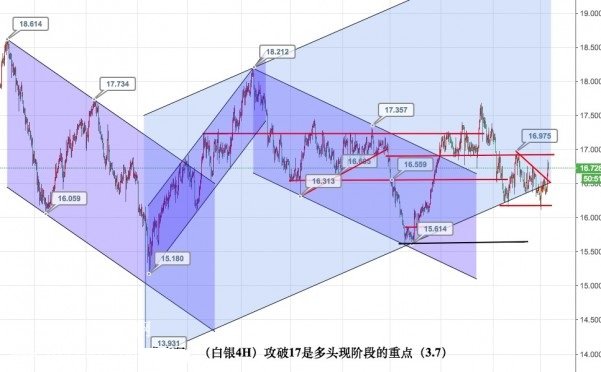 2:現階段前期持續震蕩形成的阻力16.9-17關口同時也是周線和日線級別的關鍵阻力點,后期多頭打破此關鍵阻力點后才能展開更大的空間利潤,所以現階段白銀攻破17關口就是多頭的主要任務!