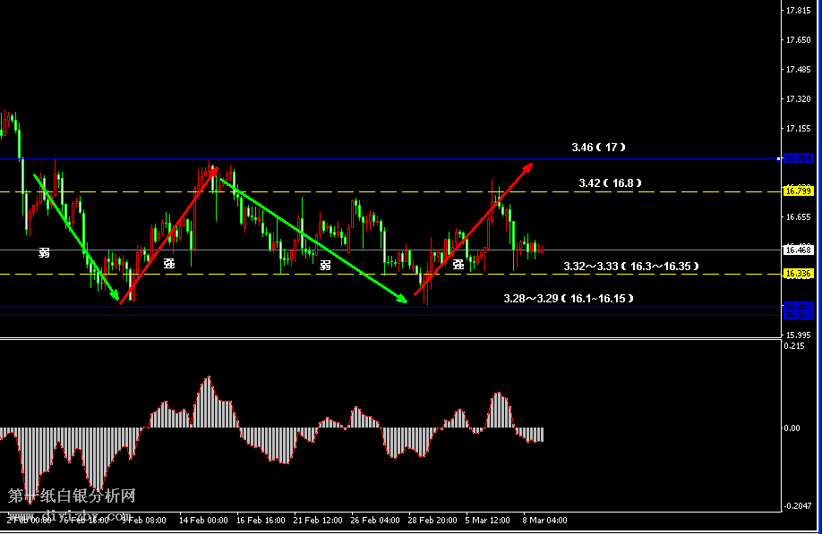 2、以上所有價格為工商銀行買入價,即紙白銀低價。進倉點位要再加0.04,出倉則不要。 3、第一紙白銀給出的所有建議僅供投資者參考,不作為下單絕對依據(jù),切勿過于依賴。 4、北京時間09:00發(fā)布此文章。 5、上一交易日白銀價格分析情況:(3月8日)白銀不改強勢震蕩 回落中空頭力量仍減弱