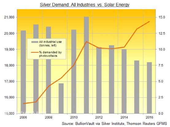 當然,我們不能想當然地假設太陽能世界的主要能源。另一方面,我們也不能假定地面上所有的銀都將專門分配給太陽能電池板生產。銀仍然是一種受歡迎的裝飾金屬,它也有許多其他的工業應用,如在釬焊,醫療器械,水凈化,電子產品等。即使考慮到最近的以及未來改進太陽能效率使銀含量下降,仍有很多白銀需求增長源于對可再生能源的需求。
