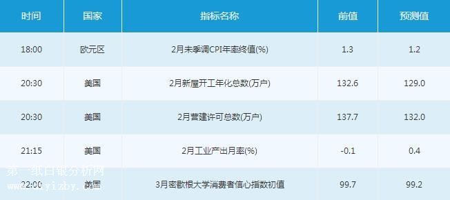 周五(3月16日)歐洲時(shí)段,投資者需關(guān)注18:00公布的歐元區(qū)2月未季調(diào)CPI年率終值。美國(guó)時(shí)段,投資者需關(guān)注20:30公布的美國(guó)2月?tīng)I(yíng)建許可總數(shù)、美國(guó)2月新屋開(kāi)工年化總數(shù)。此后,投資者還需關(guān)注21:15公布的美國(guó)2月工業(yè)產(chǎn)出月率,以及22:00公布的美國(guó)3月密歇根大學(xué)消費(fèi)者信心指數(shù)初值。