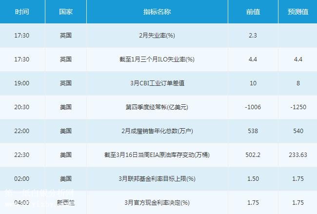 周三(3月21日)歐洲時(shí)段,投資者需關(guān)注17:30公布的英國(guó)截至1月三個(gè)月ILO失業(yè)率、英國(guó)截至1月剔除紅利三個(gè)月平均工資年率。美國(guó)時(shí)段,投資者需關(guān)注22:30公布的美國(guó)截至3月16日當(dāng)周EIA原油庫存變動(dòng)。