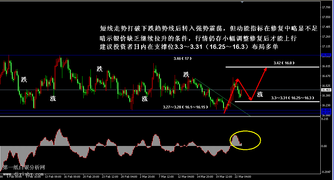 今日下方關鍵支撐位3.3~3.31(16.25~16.3)、.27(16.1)、3.21(15.8);今日上方關鍵阻力3.42~3.44(16.8~16.9)、3.45(17)、3.52(17.35)。 提示:技術僅僅是基于概率論和統計學的一種綜合分析手段,絕非預測。所以技術分析是在考慮做好止損的情況下去博取大概率事件,投資不可過于迷信技術分析。(短線操作請一定做好止損,一旦被損,代表分析師基于概率和統計的技術分析不適用于當前行情) 另外,由于紙白銀價格是國際銀價換算而來,而換算過程中涉及到人民幣對美元匯率的變化,即使在國際銀價不變化的情況下,如果人民幣貶值或升值,也會導致紙白銀價格出現變動。因此,我們的分析只采用最新的國際銀價對應的人民幣白銀價格,如與過去分析價格有出入, 投資者應知曉其原因。 1、文中價格為紙白銀價格,括號內為國際銀價,投資者可雙向參考。 2、以上所有價格為工商銀行買入價,即紙白銀低價。進倉點位要再加點差(各銀行點差不一),出倉則不要。 3、第一紙白銀給出的所有建議僅供投資者參考,不作為下單絕對依據,切勿過于依賴。 4、北京時間09:00發布此文章。 5、上一交易日白銀價格分析情況:(3月22日)白銀區間低點強勢反彈 利空出盡將迎利多