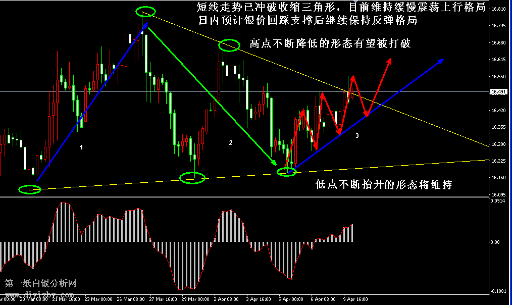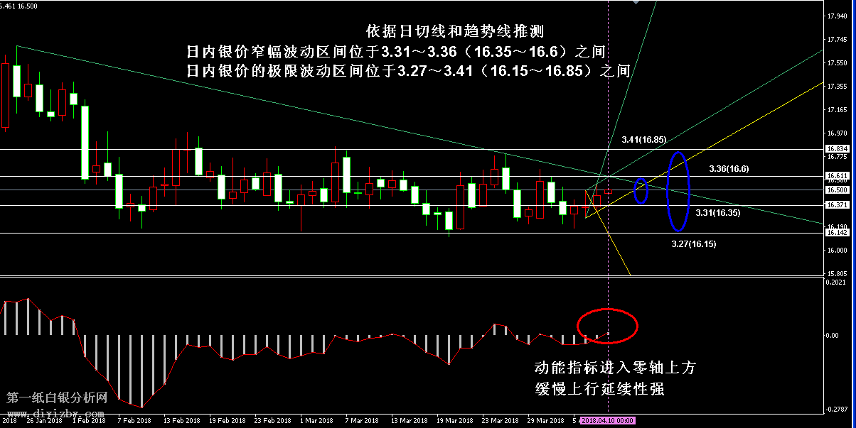 今日下方關鍵支撐位3.28~3.3(16.2~16.3)、3.26(16.1)、3.19(15.8)、3.15(15.6);今日上方關鍵阻3.36(16.6)、3.4~3.42(16.8~16.9)、3.44(17)、3.5(17.3)。 提示:技術僅僅是基于概率論和統計學的一種綜合分析手段,絕非預測。所以技術分析是在考慮做好止損的情況下去博取大概率事件,投資不可過于迷信技術分析。(短線操作請一定做好止損,一旦被損,代表分析師基于概率和統計的技術分析不適用于當前行情) 另外,由于紙白銀價格是國際銀價換算而來,而換算過程中涉及到人民幣對美元匯率的變化,即使在國際銀價不變化的情況下,如果人民幣貶值或升值,也會導致紙白銀價格出現變動。因此,我們的分析只采用最新的國際銀價對應的人民幣白銀價格,如與過去分析價格有出入, 投資者應知曉其原因。 1、文中價格為紙白銀價格,括號內為國際銀價,投資者可雙向參考。 2、以上所有價格為工商銀行買入價,即紙白銀低價。進倉點位要再加點差(各銀行點差不一),出倉則不要。 3、第一紙白銀給出的所有建議僅供投資者參考,不作為下單絕對依據,切勿過于依賴。 4、北京時間08:55發布此文章。 5、上一交易日白銀價格分析情況:(4月9日)白銀有望先上破三角形 保持震蕩上行格局