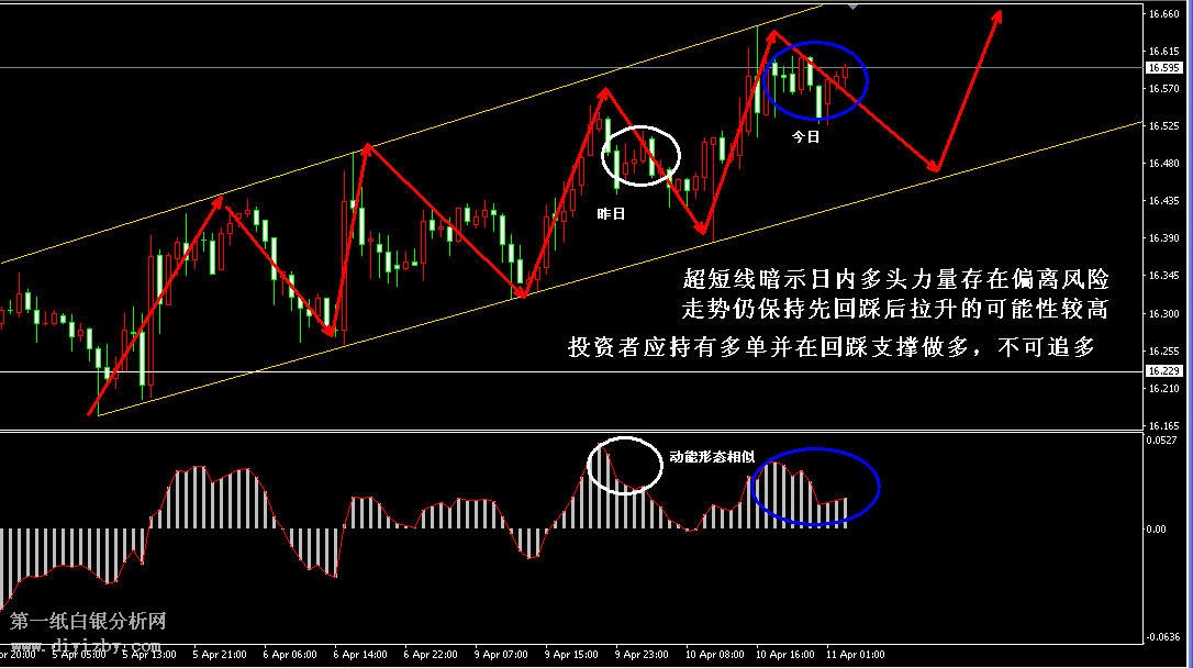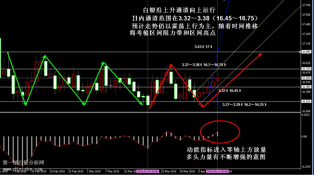 今日下方關(guān)鍵支撐位3.32(16.45)、3.27~3.28(16.2~16.25)、3.25(16.1)、3.18(15.8)、3.14(15.6);今日上方關(guān)鍵阻3.38(16.75)、3.39~3.41(16.8~16.9)、3.43(17)、3.49(17.3)。 提示:技術(shù)僅僅是基于概率論和統(tǒng)計(jì)學(xué)的一種綜合分析手段,絕非預(yù)測。所以技術(shù)分析是在考慮做好止損的情況下去博取大概率事件,投資不可過于迷信技術(shù)分析。(短線操作請一定做好止損,一旦被損,代表分析師基于概率和統(tǒng)計(jì)的技術(shù)分析不適用于當(dāng)前行情) 另外,由于紙白銀價格是國際銀價換算而來,而換算過程中涉及到人民幣對美元匯率的變化,即使在國際銀價不變化的情況下,如果人民幣貶值或升值,也會導(dǎo)致紙白銀價格出現(xiàn)變動。因此,我們的分析只采用最新的國際銀價對應(yīng)的人民幣白銀價格,如與過去分析價格有出入, 投資者應(yīng)知曉其原因。 1、文中價格為紙白銀價格,括號內(nèi)為國際銀價,投資者可雙向參考。 2、以上所有價格為工商銀行買入價,即紙白銀低價。進(jìn)倉點(diǎn)位要再加點(diǎn)差(各銀行點(diǎn)差不一),出倉則不要。 3、第一紙白銀給出的所有建議僅供投資者參考,不作為下單絕對依據(jù),切勿過于依賴。 4、北京時間08:55發(fā)布此文章。 5、上一交易日白銀價格分析情況:(4月10日)白銀緩慢上探阻力帶 波幅不大但延續(xù)上漲