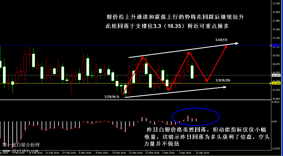 今日下方關(guān)鍵支撐位3.3(16.35)、3.27(16.2)、3.25(16.1)、3.18(15.8)、3.14(15.6);今日上方關(guān)鍵阻3.41(16.9)、3.43(17)、3.49(17.3)。 提示:技術(shù)僅僅是基于概率論和統(tǒng)計(jì)學(xué)的一種綜合分析手段,絕非預(yù)測。所以技術(shù)分析是在考慮做好止損的情況下去博取大概率事件,投資不可過于迷信技術(shù)分析。(短線操作請一定做好止損,一旦被損,代表分析師基于概率和統(tǒng)計(jì)的技術(shù)分析不適用于當(dāng)前行情) 另外,由于紙白銀價(jià)格是國際銀價(jià)換算而來,而換算過程中涉及到人民幣對美元匯率的變化,即使在國際銀價(jià)不變化的情況下,如果人民幣貶值或升值,也會導(dǎo)致紙白銀價(jià)格出現(xiàn)變動。因此,我們的分析只采用最新的國際銀價(jià)對應(yīng)的人民幣白銀價(jià)格,如與過去分析價(jià)格有出入, 投資者應(yīng)知曉其原因。 1、文中價(jià)格為紙白銀價(jià)格,括號內(nèi)為國際銀價(jià),投資者可雙向參考。 2、以上所有價(jià)格為工商銀行買入價(jià),即紙白銀低價(jià)。進(jìn)倉點(diǎn)位要再加點(diǎn)差(各銀行點(diǎn)差不一),出倉則不要。 3、第一紙白銀給出的所有建議僅供投資者參考,不作為下單絕對依據(jù),切勿過于依賴。 4、北京時(shí)間09:45發(fā)布此文章。 5、上一交易日白銀價(jià)格分析情況:(4月12日)白銀形成震蕩上漲浪 趨勢已轉(zhuǎn)強(qiáng)隨時(shí)上破