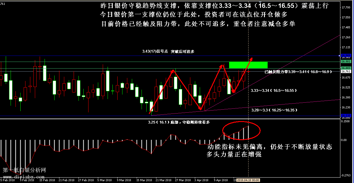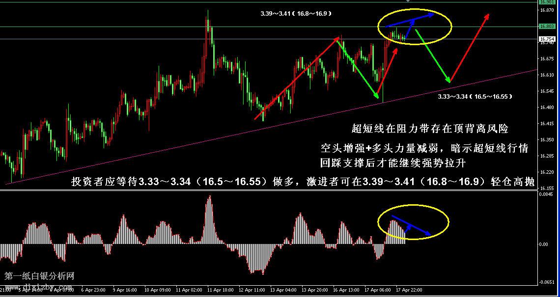 今日下方關鍵支撐位3.33~3.34(16.5~16.55)、3.28~3.3(16.25~16.35)、3.25(16.1)、3.18(15.8)、3.13(15.6);今日上方關鍵阻3.39~3.41(16.8~16.9)、3.43(17)、3.49(17.3)。 提示:技術僅僅是基于概率論和統計學的一種綜合分析手段,絕非預測。所以技術分析是在考慮做好止損的情況下去博取大概率事件,投資不可過于迷信技術分析。(短線操作請一定做好止損,一旦被損,代表分析師基于概率和統計的技術分析不適用于當前行情) 另外,由于紙白銀價格是國際銀價換算而來,而換算過程中涉及到人民幣對美元匯率的變化,即使在國際銀價不變化的情況下,如果人民幣貶值或升值,也會導致紙白銀價格出現變動。因此,我們的分析只采用最新的國際銀價對應的人民幣白銀價格,如與過去分析價格有出入, 投資者應知曉其原因。 1、文中價格為紙白銀價格,括號內為國際銀價,投資者可雙向參考。 2、以上所有價格為工商銀行買入價,即紙白銀低價。進倉點位要再加點差(各銀行點差不一),出倉則不要。 3、第一紙白銀給出的所有建議僅供投資者參考,不作為下單絕對依據,切勿過于依賴。 4、北京時間09:00發布此文章。 5、上一交易日白銀價格分析情況:(4月17日)白銀維持緩慢拉升 近期有望上破震蕩區間