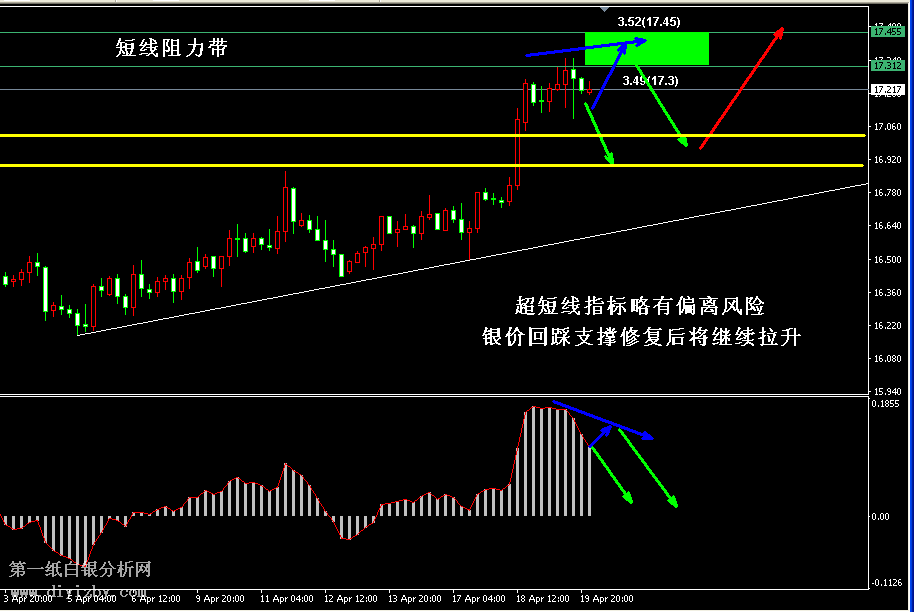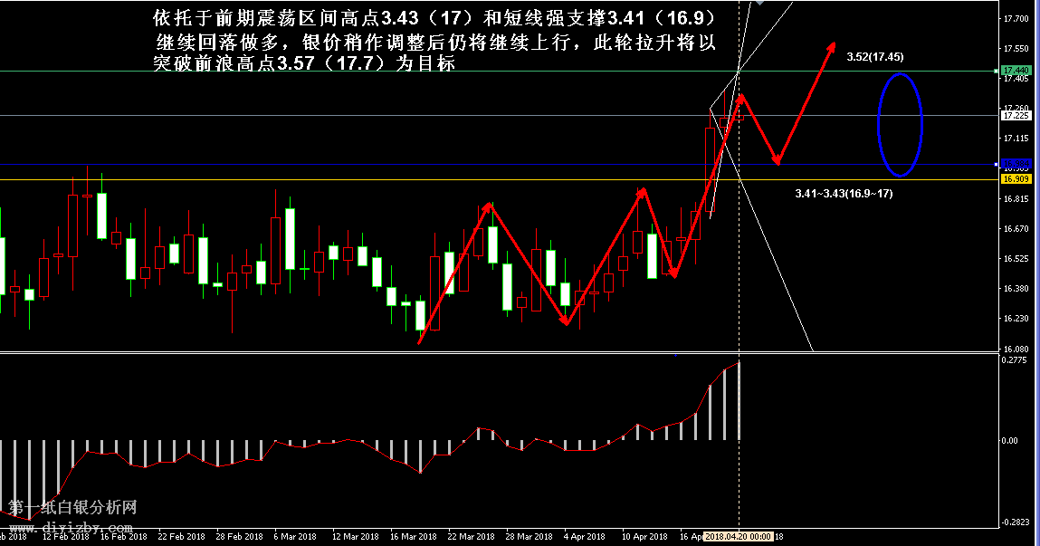 今日下方關鍵支撐位3.41~3.43(16.9~17)、3.36(16.65)、3.31(16.4)、3.25(16.1);今日上方關鍵阻3.49(17.3)、3.52(17.45)、3.62(17.95)。 提示:技術僅僅是基于概率論和統計學的一種綜合分析手段,絕非預測。所以技術分析是在考慮做好止損的情況下去博取大概率事件,投資不可過于迷信技術分析。(短線操作請一定做好止損,一旦被損,代表分析師基于概率和統計的技術分析不適用于當前行情) 另外,由于紙白銀價格是國際銀價換算而來,而換算過程中涉及到人民幣對美元匯率的變化,即使在國際銀價不變化的情況下,如果人民幣貶值或升值,也會導致紙白銀價格出現變動。因此,我們的分析只采用最新的國際銀價對應的人民幣白銀價格,如與過去分析價格有出入, 投資者應知曉其原因。 1、文中價格為紙白銀價格,括號內為國際銀價,投資者可雙向參考。 2、以上所有價格為工商銀行買入價,即紙白銀低價。進倉點位要再加點差(各銀行點差不一),出倉則不要。 3、第一紙白銀給出的所有建議僅供投資者參考,不作為下單絕對依據,切勿過于依賴。 4、北京時間09:00發布此文章。 5、上一交易日白銀價格分析情況:(4月19日)白銀上破震蕩區間 走勢進入單邊上漲格局