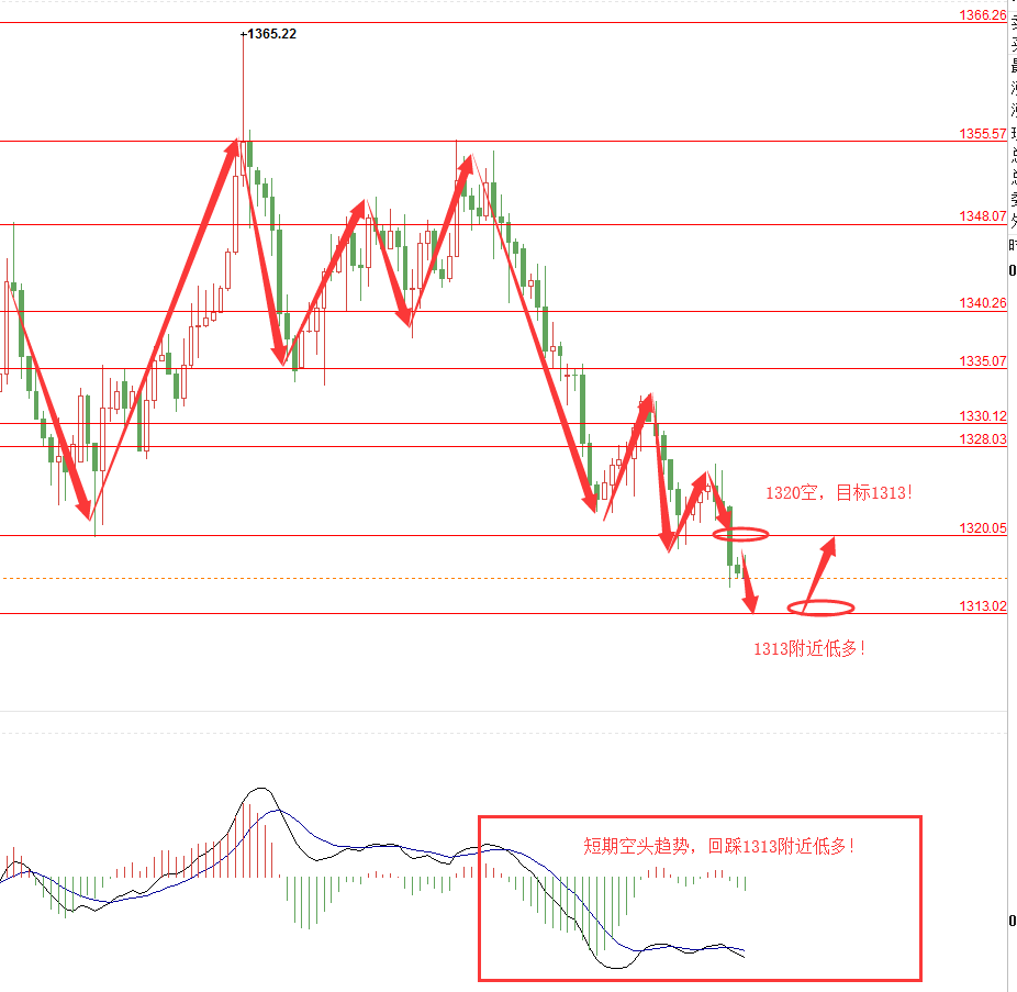 黃金目前已經破位1320支撐位,行情弱勢已經毋庸置疑,但是否會延續走回調,繼續下測千三關口支撐,現在還尚未可知。日內行情強弱是關鍵,當前上方1327為多空強弱分水嶺,如上行破位走反彈的概率較大,反之,持續承壓還將繼續弱勢運行,下方支撐看1305-09趨勢支撐位,千三關口支撐還是較強,即使近期延續走回調,也將在1305上方結束。短線先關注1327-28阻力情況;日內走勢,1310-1333區域高空低多。