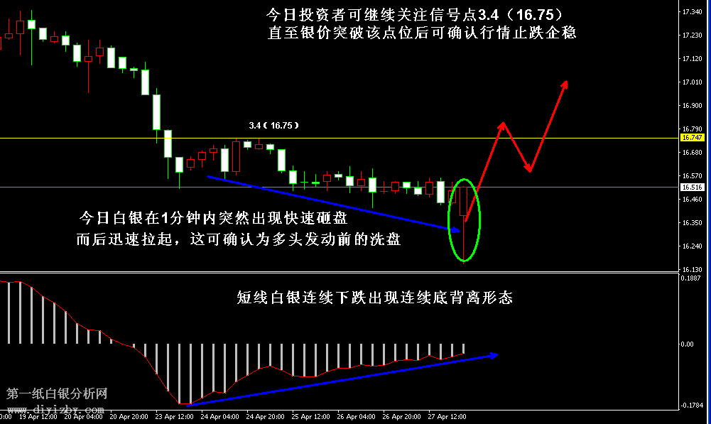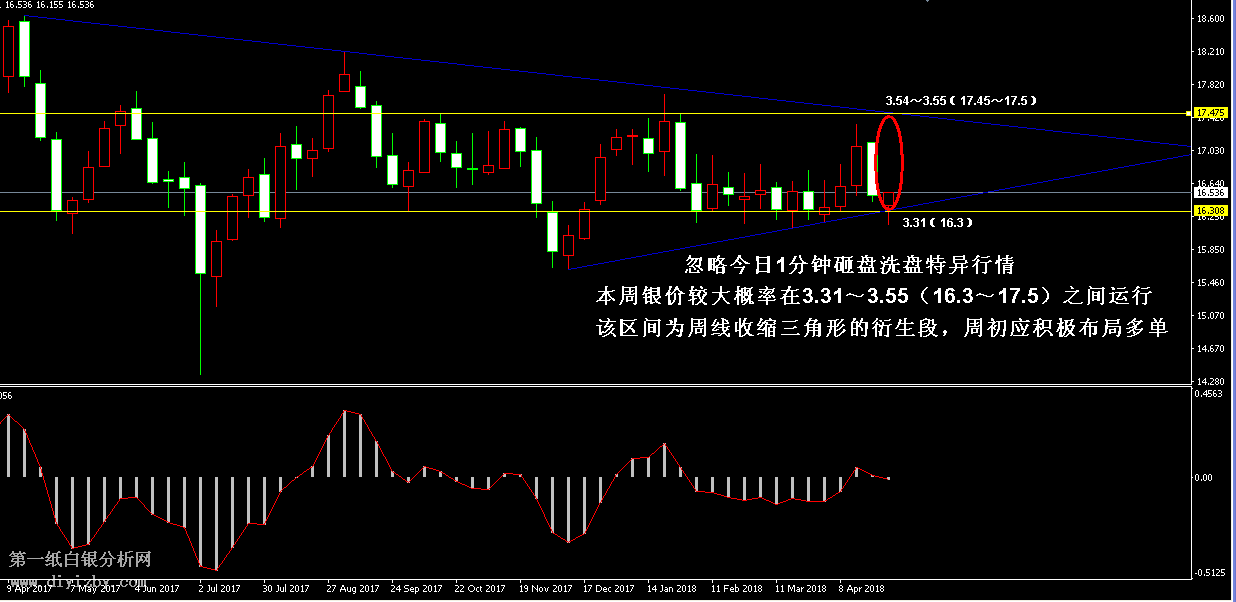 今日下方關(guān)鍵支撐位3.31~3.33(16.25~16.3)、3.26(16.1);今日上方關(guān)鍵阻3.4(16.75)、3.46~3.47(17.05~17.1)、3.54~3.55(17.45~17.55)、3.65(17.95)。 提示:技術(shù)僅僅是基于概率論和統(tǒng)計(jì)學(xué)的一種綜合分析手段,絕非預(yù)測(cè)。所以技術(shù)分析是在考慮做好止損的情況下去博取大概率事件,投資不可過于迷信技術(shù)分析。(短線操作請(qǐng)一定做好止損,一旦被損,代表分析師基于概率和統(tǒng)計(jì)的技術(shù)分析不適用于當(dāng)前行情) 另外,由于紙白銀價(jià)格是國(guó)際銀價(jià)換算而來(lái),而換算過程中涉及到人民幣對(duì)美元匯率的變化,即使在國(guó)際銀價(jià)不變化的情況下,如果人民幣貶值或升值,也會(huì)導(dǎo)致紙白銀價(jià)格出現(xiàn)變動(dòng)。因此,我們的分析只采用最新的國(guó)際銀價(jià)對(duì)應(yīng)的人民幣白銀價(jià)格,如與過去分析價(jià)格有出入, 投資者應(yīng)知曉其原因。 1、文中價(jià)格為紙白銀價(jià)格,括號(hào)內(nèi)為國(guó)際銀價(jià),投資者可雙向參考。 2、以上所有價(jià)格為工商銀行買入價(jià),即紙白銀低價(jià)。進(jìn)倉(cāng)點(diǎn)位要再加點(diǎn)差(各銀行點(diǎn)差不一),出倉(cāng)則不要。 3、第一紙白銀給出的所有建議僅供投資者參考,不作為下單絕對(duì)依據(jù),切勿過于依賴。 4、北京時(shí)間09:00發(fā)布此文章。 5、上一交易日白銀價(jià)格分析情況:(4月28日)周評(píng):白銀上漲形態(tài)未變 下周關(guān)注反彈力度