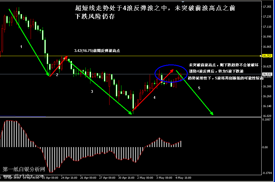 今日下方關(guān)鍵支撐3.29~3.3(16.15~16.2)、3.26(16)、3.22(15.8)、3.18(15.6);今日上方關(guān)鍵阻3.38~3.39(16.55~16.6)、3.42(16.75)、3.47~3.48(17~17.05)、3.55(17.4)。 提示:技術(shù)僅僅是基于概率論和統(tǒng)計學的一種綜合分析手段,絕非預(yù)測。所以技術(shù)分析是在考慮做好止損的情況下去博取大概率事件,投資不可過于迷信技術(shù)分析。(短線操作請一定做好止損,一旦被損,代表分析師基于概率和統(tǒng)計的技術(shù)分析不適用于當前行情) 另外,由于紙白銀價格是國際銀價換算而來,而換算過程中涉及到人民幣對美元匯率的變化,即使在國際銀價不變化的情況下,如果人民幣貶值或升值,也會導致紙白銀價格出現(xiàn)變動。因此,我們的分析只采用最新的國際銀價對應(yīng)的人民幣白銀價格,如與過去分析價格有出入, 投資者應(yīng)知曉其原因。 1、文中價格為紙白銀價格,括號內(nèi)為國際銀價,投資者可雙向參考。 2、以上所有價格為工商銀行買入價,即紙白銀低價。進倉點位要再加點差(各銀行點差不一),出倉則不要。 3、第一紙白銀給出的所有建議僅供投資者參考,不作為下單絕對依據(jù),切勿過于依賴。 4、北京時間09:00發(fā)布此文章。 5、上一交易日白銀價格分析情況:(5月4日)白銀阻力位沖高回落 等待非農(nóng)指引方向