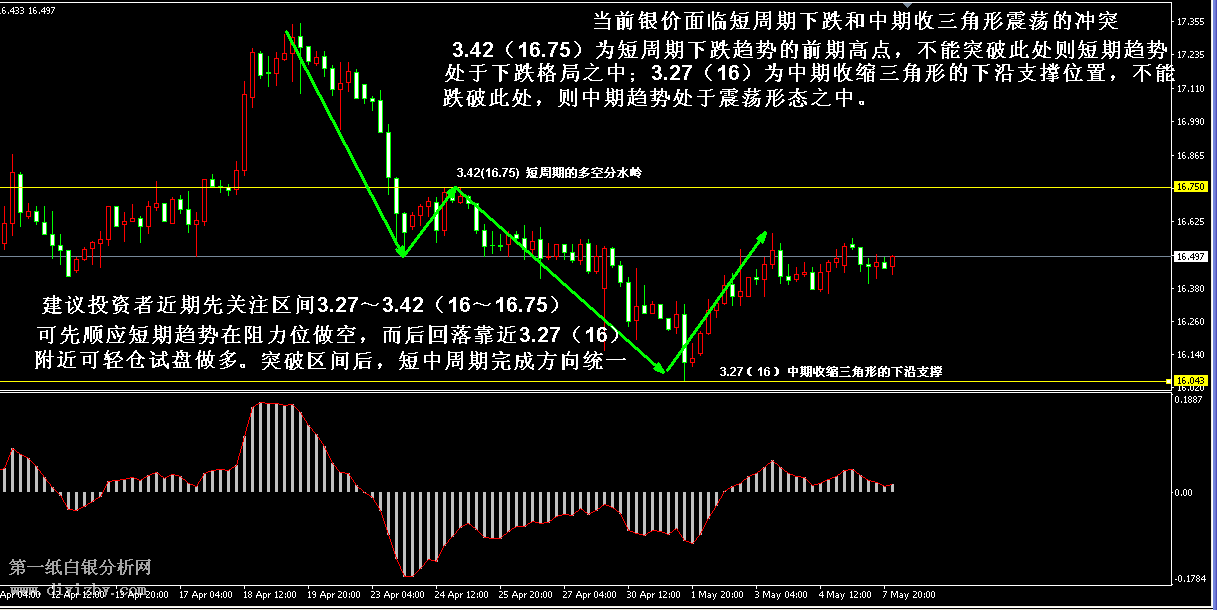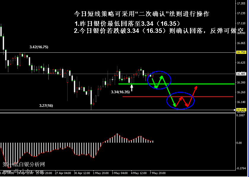 今日下方關鍵支撐3.29~3.3(16.1~16.15)、3.27(16)、3.23(15.8)、3.19(15.6);今日上方關鍵阻3.38~3.39(16.55~16.6)、3.42(16.75)、3.48~3.51(17.05~17.2)、3.55(17.4)。 提示:技術僅僅是基于概率論和統(tǒng)計學的一種綜合分析手段,絕非預測。所以技術分析是在考慮做好止損的情況下去博取大概率事件,投資不可過于迷信技術分析。(短線操作請一定做好止損,一旦被損,代表分析師基于概率和統(tǒng)計的技術分析不適用于當前行情) 另外,由于紙白銀價格是國際銀價換算而來,而換算過程中涉及到人民幣對美元匯率的變化,即使在國際銀價不變化的情況下,如果人民幣貶值或升值,也會導致紙白銀價格出現(xiàn)變動。因此,我們的分析只采用最新的國際銀價對應的人民幣白銀價格,如與過去分析價格有出入, 投資者應知曉其原因。 1、文中價格為紙白銀價格,括號內(nèi)為國際銀價,投資者可雙向參考。 2、以上所有價格為工商銀行買入價,即紙白銀低價。進倉點位要再加點差(各銀行點差不一),出倉則不要。 3、第一紙白銀給出的所有建議僅供投資者參考,不作為下單絕對依據(jù),切勿過于依賴。 4、北京時間09:00發(fā)布此文章。 5、上一交易日白銀價格分析情況:(5月7日)白銀反彈但暫未反轉 密切關注信號點突破