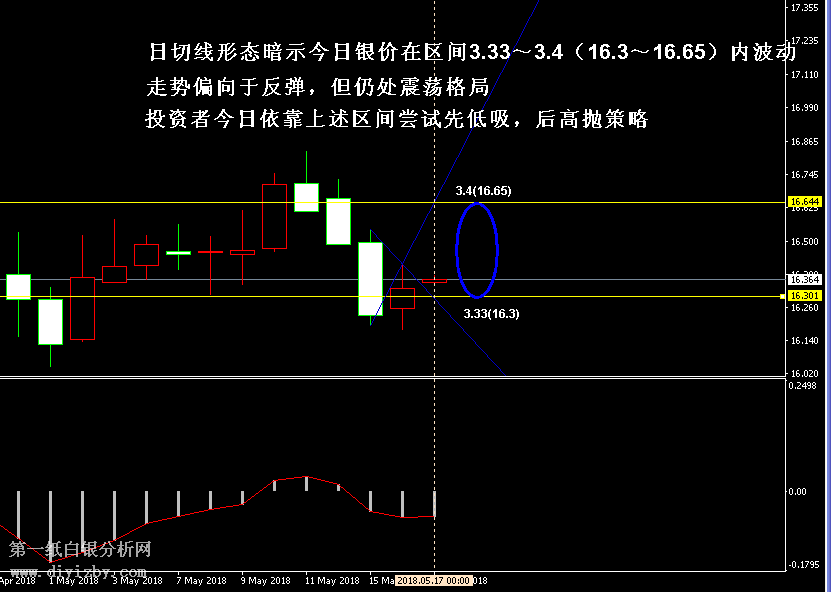 今日下方關鍵支撐3.3~3.31(16.2)、3.26(16);今日上方關鍵阻3.41(16.65)、3.49~3.52(17.05~17.2)、3.54(17.3)。 提示:技術僅僅是基于概率論和統計學的一種綜合分析手段,絕非預測。所以技術分析是在考慮做好止損的情況下去博取大概率事件,投資不可過于迷信技術分析。(短線操作請一定做好止損,一旦被損,代表分析師基于概率和統計的技術分析不適用于當前行情) 另外,由于紙白銀價格是國際銀價換算而來,而換算過程中涉及到人民幣對美元匯率的變化,即使在國際銀價不變化的情況下,如果人民幣貶值或升值,也會導致紙白銀價格出現變動。因此,我們的分析只采用最新的國際銀價對應的人民幣白銀價格,如與過去分析價格有出入, 投資者應知曉其原因。 1、文中價格為紙白銀價格,括號內為國際銀價,投資者可雙向參考。 2、以上所有價格為工商銀行買入價,即紙白銀低價。進倉點位要再加點差(各銀行點差不一),出倉則不要。 3、第一紙白銀給出的所有建議僅供投資者參考,不作為下單絕對依據,切勿過于依賴。 4、北京時間09:00發布此文章。 5、上一交易日白銀價格分析情況:(5月16日)白銀正處于關鍵節點 守穩底部前難言下跌