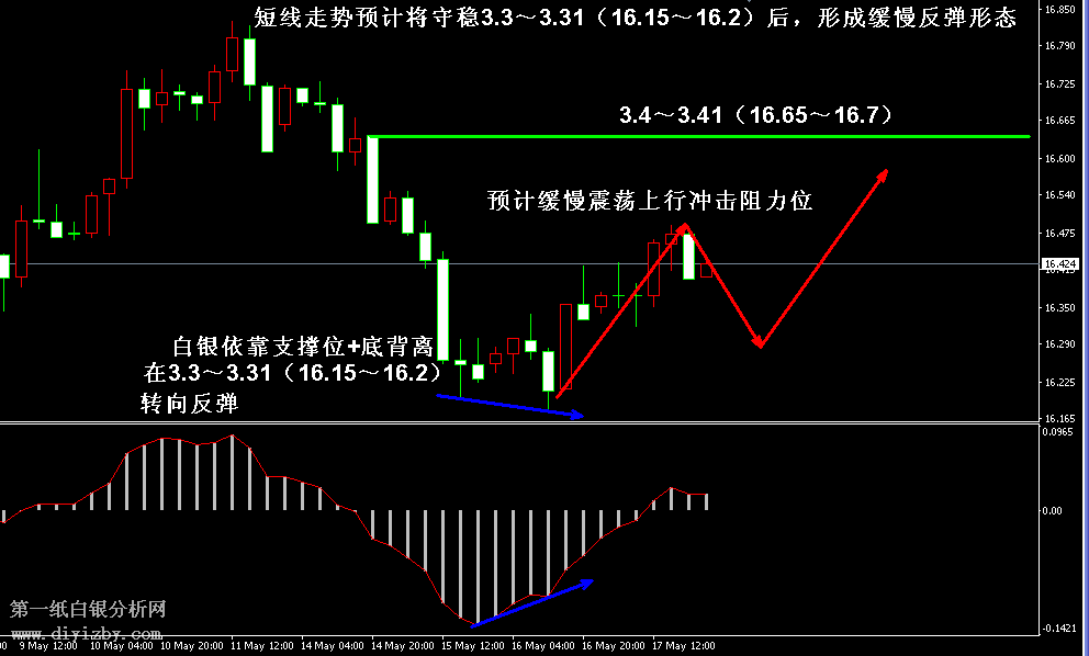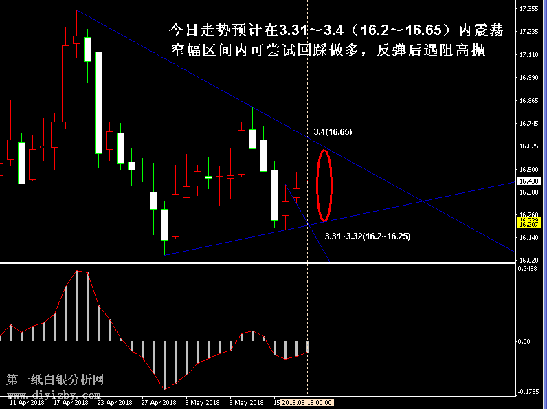 今日下方關鍵支撐3.31~3.32(16.2~16.25)、3.27(16);今日上方關鍵阻3.4~3.41(16.65~16.7)、3.48~3.51(17.05~17.2)、3.53(17.3)。 提示:技術僅僅是基于概率論和統計學的一種綜合分析手段,絕非預測。所以技術分析是在考慮做好止損的情況下去博取大概率事件,投資不可過于迷信技術分析。(短線操作請一定做好止損,一旦被損,代表分析師基于概率和統計的技術分析不適用于當前行情) 另外,由于紙白銀價格是國際銀價換算而來,而換算過程中涉及到人民幣對美元匯率的變化,即使在國際銀價不變化的情況下,如果人民幣貶值或升值,也會導致紙白銀價格出現變動。因此,我們的分析只采用最新的國際銀價對應的人民幣白銀價格,如與過去分析價格有出入, 投資者應知曉其原因。 1、文中價格為紙白銀價格,括號內為國際銀價,投資者可雙向參考。 2、以上所有價格為工商銀行買入價,即紙白銀低價。進倉點位要再加點差(各銀行點差不一),出倉則不要。 3、第一紙白銀給出的所有建議僅供投資者參考,不作為下單絕對依據,切勿過于依賴。 4、北京時間09:00發布此文章。 5、上一交易日白銀價格分析情況:(5月17日)白銀強支撐多頭增強明顯 短線將延續反彈
