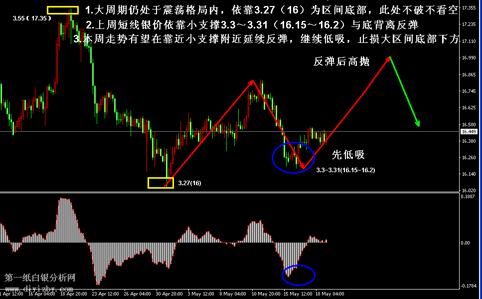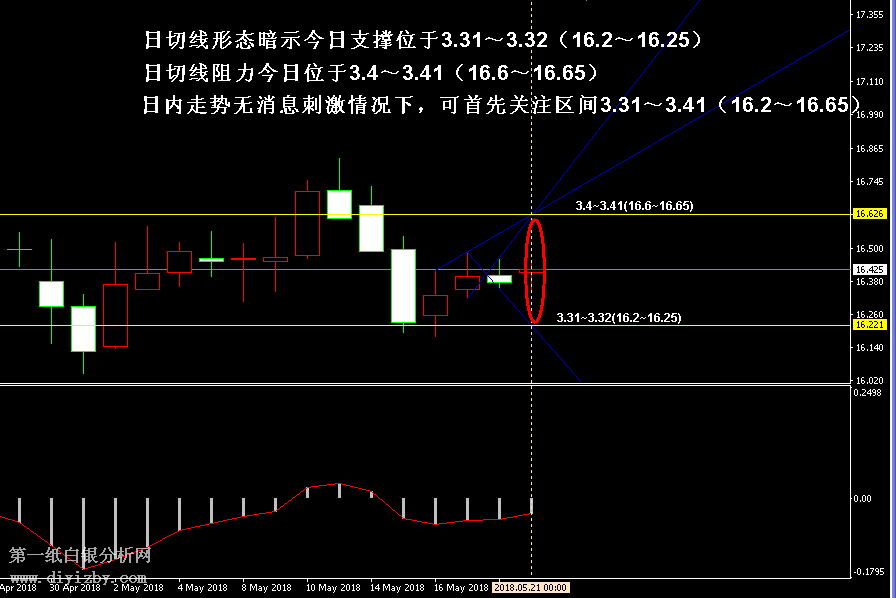 今日下方關(guān)鍵支撐3.31(16.2)、3.27~3.29(16~16.1);今日上方關(guān)鍵阻3.41(16.65)、3.49(17.05)、3.53(17.25)、3.55(17.35)。 提示:技術(shù)僅僅是基于概率論和統(tǒng)計學的一種綜合分析手段,絕非預測。所以技術(shù)分析是在考慮做好止損的情況下去博取大概率事件,投資不可過于迷信技術(shù)分析。(短線操作請一定做好止損,一旦被損,代表分析師基于概率和統(tǒng)計的技術(shù)分析不適用于當前行情) 另外,由于紙白銀價格是國際銀價換算而來,而換算過程中涉及到人民幣對美元匯率的變化,即使在國際銀價不變化的情況下,如果人民幣貶值或升值,也會導致紙白銀價格出現(xiàn)變動。因此,我們的分析只采用最新的國際銀價對應的人民幣白銀價格,如與過去分析價格有出入, 投資者應知曉其原因。 1、文中價格為紙白銀價格,括號內(nèi)為國際銀價,投資者可雙向參考。 2、以上所有價格為工商銀行買入價,即紙白銀低價。進倉點位要再加點差(各銀行點差不一),出倉則不要。 3、第一紙白銀給出的所有建議僅供投資者參考,不作為下單絕對依據(jù),切勿過于依賴。 4、北京時間09:00發(fā)布此文章。 5、上一交易日白銀價格分析情況:(5月18日)白銀守穩(wěn)支撐緩慢反彈 多空疲軟難逃震蕩