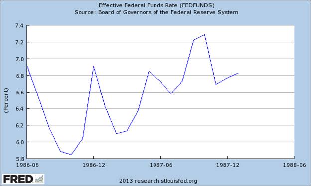 它不是直到1974年中期,美聯(lián)儲(chǔ)開始降低利率和放松錢。雖然花了大約6個(gè)月,收到預(yù)期的效果,到1975年,道瓊斯指數(shù)展開了反彈,1976年初已經(jīng)完全回顧了1973年至1974年下降。 下一個(gè)主要的崩潰,當(dāng)然是1987年10月股市暴跌,親眼目睹了1天下降了22%,在道瓊斯指數(shù)。毫不奇怪,10月'87崩潰之前上升的聯(lián)邦基金利率在今年崩潰之前。有效率為7.3%左右,上升約5.8%的速度增長,在飛機(jī)墜毀前,當(dāng)時(shí)的崩潰。