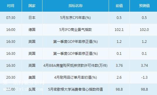 周五(5月25日)亞歐時段,投資者需關注07:30公布的日本5月東京CPI年率,16:00公布的德國5月IFO商業景氣指數,16:30的英國第一季度GDP年率修正值、英國第一季度GDP季率修正值。
