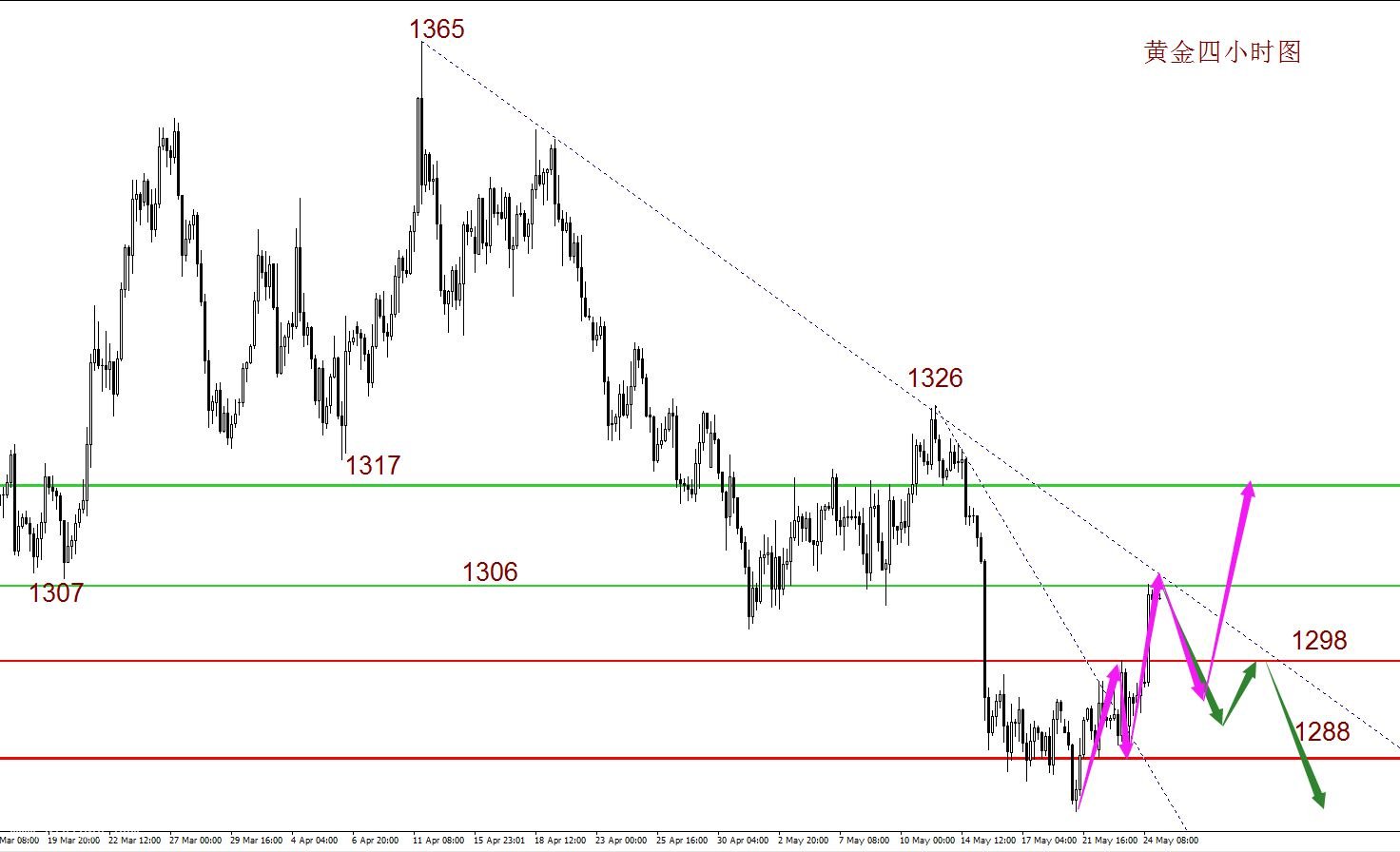 昨日美國總統(tǒng)特朗普宣布取消與朝鮮領(lǐng)導(dǎo)人的6月會晤,消息傳來之后,金融市場掀起巨瀾:貴金屬多頭終于迎來翻身機(jī)會,截止收盤,黃金上漲0.85%,報1304美元/盎司;白銀上漲1.31%,收報16.69美元/盎司。 特金會宣布取消 貴金屬多頭迎來反擊 據(jù)新華社報道,美國總統(tǒng)特朗普24日說,因近期朝鮮表示出的“公開敵意”,他決定取消原定于6月中旬與朝鮮最高領(lǐng)導(dǎo)人在新加坡的會晤。白宮當(dāng)天早上發(fā)布了一封特朗普致朝鮮的公開信。特朗普在信中說,他十分期待與金正恩的會面,但朝方在近日展現(xiàn)出“極大怒氣與公開敵意”,他認(rèn)為當(dāng)前已不適合舉行這次計(jì)劃已久的會晤。特朗普還稱美國軍方將“準(zhǔn)備就緒”,警告金正恩“別做傻事”。 據(jù)華爾街日報,特朗普政府正考慮最早于下周對朝鮮實(shí)施新的制裁。但后來白宮官員稱,對朝討論渠道開放,不過朝方首先必須改變措辭。特朗普隨后也表示,“可能”會在6月12日或稍晚舉行“特金會”。 就在5月24日,新華社還發(fā)布消息稱,朝鮮24日廢棄位于朝鮮東北部的豐溪里核試驗(yàn)場。朝鮮外務(wù)省副相崔善姬在周四早些時候發(fā)布的一份聲明中警告稱,如果6月12日的會談被取消,美國將在一場“核攤牌”中與朝鮮對峙。 特金峰會泡湯的消息傳來之后,金融市場短線大波動。現(xiàn)貨黃金短線拉升約7美元,升穿1300美元關(guān)鍵水準(zhǔn),刷新日高至1306.5美元/盎司。數(shù)據(jù)顯示,COMEX最活躍黃金期貨合約在北京時間21:50一分鐘內(nèi)成交量為10197手,交易合約總價值逾13億美元;隨后在北京時間21:52-21:55四分鐘內(nèi)成交量為12423手,交易合約總價值逾16億美元。 周四黃金的上漲除了地緣政治因素之外,美聯(lián)儲對通脹的看法也是助力之一。近期美聯(lián)儲官員及美聯(lián)儲會議紀(jì)要提及通脹上升時并不顯得十分擔(dān)心,給了投資者更多的信心。周四凌晨公布的美聯(lián)儲會議紀(jì)要也并未暗示貨幣緊縮速度加快。 數(shù)據(jù)方面,日內(nèi)公布的美國至5月19日當(dāng)周初請失業(yè)金人數(shù)為23.4萬人,高于前值和預(yù)期,刷新7周高位,但依舊維持在健康勞動市場水平之下。 此外,周四公布的美國3月FHFA房價指數(shù)月率為0.1%,遠(yuǎn)低于前值和預(yù)期0.6%;美國至5月20日當(dāng)周彭博消費(fèi)者信心指數(shù)55.2,高于前值54.6和預(yù)期54.6。美國4月成屋銷售總數(shù)年化為546萬戶,低于前值560萬戶及預(yù)期557萬戶。 今日美聯(lián)儲一把手鮑威爾將閃耀登場 周五21:20,美聯(lián)儲主席鮑威爾將參加瑞典央行第350屆會議的小組討論會,主題為“金融穩(wěn)定性與央行的透明度”。周五凌晨,特朗普正式簽署《多德弗蘭克》法案的改革議案,旨在為美國金融行業(yè)松綁,但恐將威脅金融穩(wěn)定性。今晚鮑威爾有望針對這個話題作出評論。 此外,亞特蘭大聯(lián)儲主席、2018年FOMC票委博斯蒂克、芝加哥聯(lián)儲主席埃文斯、達(dá)拉斯聯(lián)儲主席卡普蘭將參加“第八階段會議:決策者小組”。市場將密切關(guān)注他們針對美聯(lián)儲決策的講話,旨在捕捉政策風(fēng)向。 黃金白銀多頭表現(xiàn)強(qiáng)勢 將考驗(yàn)阻力位壓制 黃金:黃金4小時周期處于上升趨勢中,從K線結(jié)構(gòu)上來看當(dāng)下K線低位調(diào)整打破1326下跌趨勢后快速上行,理論上已經(jīng)進(jìn)入相對1326下跌以來的反彈乃至上漲趨勢,而K線結(jié)構(gòu)同樣也確實(shí)運(yùn)行在上升結(jié)構(gòu)當(dāng)中,從K線形態(tài)來看,前期低位經(jīng)過調(diào)整后拉出決定性大陽線,從博弈的角度上來看是對前期調(diào)整的一次爆發(fā)。在均線走勢上K線持續(xù)上攻帶動多重均線發(fā)散往上,目前來看中短期均線快速上攻形成均線多頭排列,上穿60MA之后受制于120MA附近也意味著行情存在調(diào)整的可能。指標(biāo)上KDJ經(jīng)過長時間的震蕩調(diào)整目前已經(jīng)運(yùn)行至相對高位,也就是已經(jīng)具備回調(diào)的條件,MACD上快線慢線持續(xù)上攻,動能紅柱快速釋放成功造就大陽線上行,而當(dāng)下動能柱開始趨向平穩(wěn),快線即將超買,理論上存在回調(diào)的可能性。總體上黃金當(dāng)前短期結(jié)構(gòu)處于多頭走勢,但是長期趨勢仍然在下行趨勢當(dāng)中,而均線雖然往上,但是K線與長期均線明顯背離,加上KDJ指標(biāo)幾天以來首次到達(dá)100之上,以及MACD預(yù)期的多頭已經(jīng)兌現(xiàn),所以前期預(yù)期的多頭理論上已經(jīng)兌現(xiàn),當(dāng)下市場預(yù)期將出現(xiàn)兌現(xiàn)目標(biāo)后的回撤概率較大。 黃金策略:金價短線多頭表現(xiàn)強(qiáng)勢,但將面臨下行趨勢線壓制考驗(yàn),日內(nèi)或有回調(diào),關(guān)注千三關(guān)口表現(xiàn)。 上方阻力:1307 1310 1317 下方支撐:1300 1396 1300 白銀:隔夜美指高位回落收陰間接提振白銀上行,銀價表現(xiàn)強(qiáng)勢一舉上破多重均線壓制日圖報收大陽線。盤面來看,銀價已經(jīng)站上中期均線支撐且副盤MACD雙線上穿0軸紅柱延續(xù)表現(xiàn)逐漸轉(zhuǎn)為樂觀,不過整體處收斂三角形的大格局依舊沒有改變,銀價若想進(jìn)一步上破,必須在后市突破上軌壓制。建議目前依舊處區(qū)間盤整,故銀價上行依舊面臨上方各關(guān)鍵區(qū)域壓制,操作上可延續(x