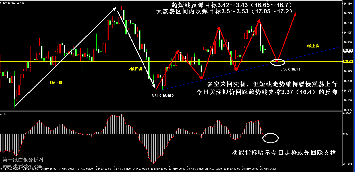 今日下方關(guān)鍵支撐3.36(16.4)、3.31~3.32(16.15~16.2)、3.28(16);今日上方關(guān)鍵阻3.41~3.42(16.65~16.7)、3.5~3.53(17.05~17.2)、3.56(17.35)。 提示:技術(shù)僅僅是基于概率論和統(tǒng)計(jì)學(xué)的一種綜合分析手段,絕非預(yù)測(cè)。所以技術(shù)分析是在考慮做好止損的情況下去博取大概率事件,投資不可過于迷信技術(shù)分析。(短線操作請(qǐng)一定做好止損,一旦被損,代表分析師基于概率和統(tǒng)計(jì)的技術(shù)分析不適用于當(dāng)前行情) 另外,由于紙白銀價(jià)格是國(guó)際銀價(jià)換算而來,而換算過程中涉及到人民幣對(duì)美元匯率的變化,即使在國(guó)際銀價(jià)不變化的情況下,如果人民幣貶值或升值,也會(huì)導(dǎo)致紙白銀價(jià)格出現(xiàn)變動(dòng)。因此,我們的分析只采用最新的國(guó)際銀價(jià)對(duì)應(yīng)的人民幣白銀價(jià)格,如與過去分析價(jià)格有出入, 投資者應(yīng)知曉其原因。 1、文中價(jià)格為紙白銀價(jià)格,括號(hào)內(nèi)為國(guó)際銀價(jià),投資者可雙向參考。 2、以上所有價(jià)格為工商銀行買入價(jià),即紙白銀低價(jià)。進(jìn)倉(cāng)點(diǎn)位要再加點(diǎn)差(各銀行點(diǎn)差不一),出倉(cāng)則不要。 3、第一紙白銀給出的所有建議僅供投資者參考,不作為下單絕對(duì)依據(jù),切勿過于依賴。 4、北京時(shí)間09:00發(fā)布此文章。 5、上一交易日白銀價(jià)格分析情況:(5月26日)周評(píng):白銀短線多頭仍占優(yōu) 下周將延續(xù)反彈