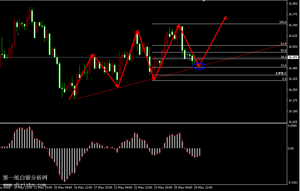 今日下方關(guān)鍵支撐3.37(16.4)、3.32(16.15)、3.29(16);今日上方關(guān)鍵阻3.42~3.43(16.65~16.7)、3.5~3.53(17.05~17.2)、3.56(17.35)。 提示:技術(shù)僅僅是基于概率論和統(tǒng)計(jì)學(xué)的一種綜合分析手段,絕非預(yù)測(cè)。所以技術(shù)分析是在考慮做好止損的情況下去博取大概率事件,投資不可過(guò)于迷信技術(shù)分析。(短線操作請(qǐng)一定做好止損,一旦被損,代表分析師基于概率和統(tǒng)計(jì)的技術(shù)分析不適用于當(dāng)前行情) 另外,由于紙白銀價(jià)格是國(guó)際銀價(jià)換算而來(lái),而換算過(guò)程中涉及到人民幣對(duì)美元匯率的變化,即使在國(guó)際銀價(jià)不變化的情況下,如果人民幣貶值或升值,也會(huì)導(dǎo)致紙白銀價(jià)格出現(xiàn)變動(dòng)。因此,我們的分析只采用最新的國(guó)際銀價(jià)對(duì)應(yīng)的人民幣白銀價(jià)格,如與過(guò)去分析價(jià)格有出入, 投資者應(yīng)知曉其原因。 1、文中價(jià)格為紙白銀價(jià)格,括號(hào)內(nèi)為國(guó)際銀價(jià),投資者可雙向參考。 2、以上所有價(jià)格為工商銀行買(mǎi)入價(jià),即紙白銀低價(jià)。進(jìn)倉(cāng)點(diǎn)位要再加點(diǎn)差(各銀行點(diǎn)差不一),出倉(cāng)則不要。 3、第一紙白銀給出的所有建議僅供投資者參考,不作為下單絕對(duì)依據(jù),切勿過(guò)于依賴。 4、北京時(shí)間09:00發(fā)布此文章。 5、上一交易日白銀價(jià)格分析情況:(5月28日)白銀有望回踩趨勢(shì)線 關(guān)注支撐位反彈力度
