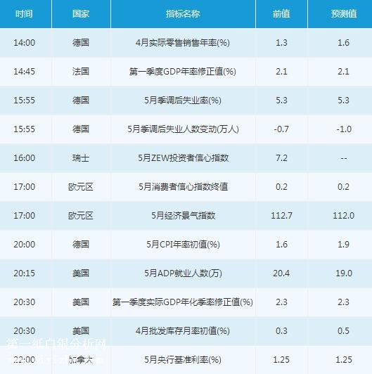 美盤時段,投資者需關注20:00公布的德國5月CPI年率初值,20:15公布的美國5月ADP就業人數,及20:30的美國第一季度實際GDP年化季率修正值。