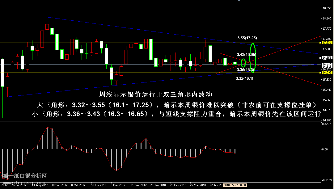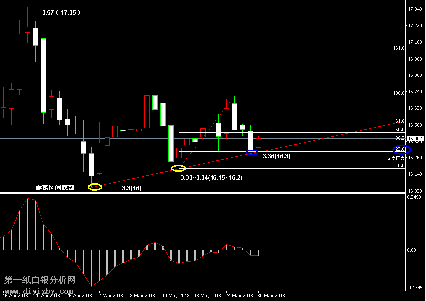 今日下方關鍵支撐3.36(16.3)、3.33~3.34(16.15~16.2)、3.3(16);今日上方關鍵阻3.43~3.44(16.65~16.7)、3.51~3.54(17.05~17.2)、3.57(17.35)。 提示:技術僅僅是基于概率論和統計學的一種綜合分析手段,絕非預測。所以技術分析是在考慮做好止損的情況下去博取大概率事件,投資不可過于迷信技術分析。(短線操作請一定做好止損,一旦被損,代表分析師基于概率和統計的技術分析不適用于當前行情) 另外,由于紙白銀價格是國際銀價換算而來,而換算過程中涉及到人民幣對美元匯率的變化,即使在國際銀價不變化的情況下,如果人民幣貶值或升值,也會導致紙白銀價格出現變動。因此,我們的分析只采用最新的國際銀價對應的人民幣白銀價格,如與過去分析價格有出入, 投資者應知曉其原因。 1、文中價格為紙白銀價格,括號內為國際銀價,投資者可雙向參考。 2、以上所有價格為工商銀行買入價,即紙白銀低價。進倉點位要再加點差(各銀行點差不一),出倉則不要。 3、第一紙白銀給出的所有建議僅供投資者參考,不作為下單絕對依據,切勿過于依賴。 4、北京時間09:00發布此文章。 5、上一交易日白銀價格分析情況:(5月29日)白銀考驗雙趨勢線支撐 買盤力量有望增強