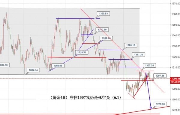 如圖:金價下探1282后的反抽目前已經在4小時圖中3次測試1307的壓制卻依然未果,雖然中期以1365為高點的下降趨勢線出現了破位,但周初1297的破位依然顯示出多頭的動能不足,而今日市場的交易核心依然是1297和1307的破位,非農數據公布前預計震蕩不會改變!非農登臺前若破位1297-1307的區間,則多空整點已經給出了答案,順勢跟進即可!若非農前多空仍不分勝負,那么多頭思路的朋友請守住周初低點1292為防守,而空頭思路的我們依然是守住1307為防守!