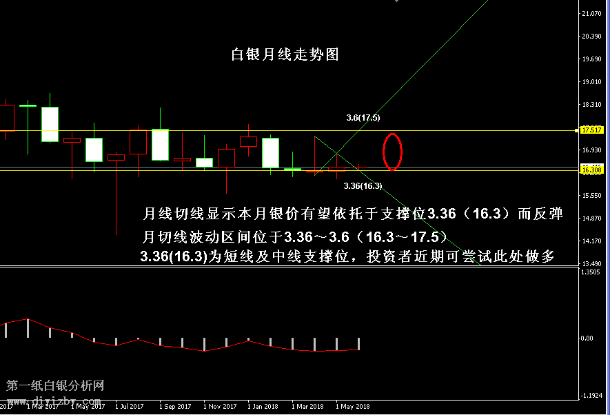 白銀短線策略:(波段:持倉觀望;短線:先低吸后高拋)。 上周我們建議投資者關注了白銀5月收盤狀況,最終銀價收盤價格站在支撐位3.36(16.3)上方,這極大程度的暗示了6月銀價將以3.36(16.3)為支撐向上反彈的可能性。如下圖所示為白銀月線走勢圖,圖中綠線所示為月線切線延伸段在本月的支撐和阻力,其中支撐位在3.36(16.3)附近,阻力位在3.6(17.5)附近,由該切線圈定的區間位于3.36~3.6(16.3~17.5)之間。這暗示6月白銀價格有望依托于3.36(16.3)而向上反彈,最終沖擊3.6(17.5)的月線阻力。而3.36(16.3)同時也是短線支撐位,這強化了該點位具有買盤支撐的意義。本月投資者可首先在3.36(16.3)附近嘗試做多,一方面博取短線行情向上反彈至3.43(16.65)和3.51~3.54(17.05~17.2)的可能性,另一方面也可關注月線行情反彈的可能性,建議多單嚴格止損底部3.3(16)下方即可。
