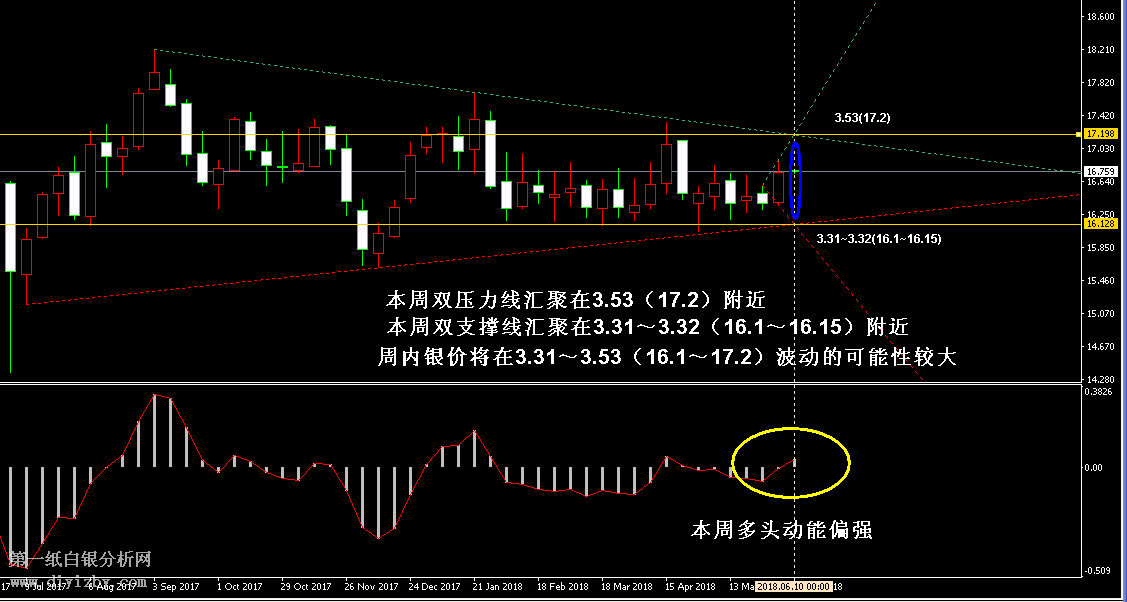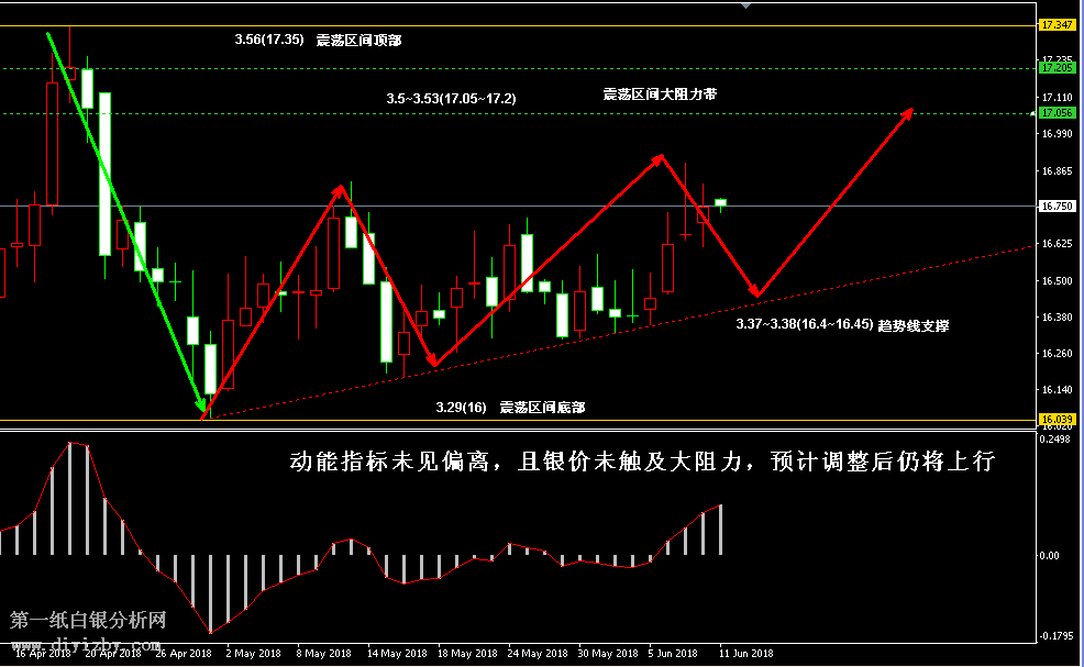 今日下方關(guān)鍵支撐3.37~3.38(16.4~16.45)、3.31~3.33(16.1~16.2)、3.29(16);今日上方關(guān)鍵阻3.5~3.53(17.05~17.2)、3.56(17.35)。 提示:技術(shù)僅僅是基于概率論和統(tǒng)計(jì)學(xué)的一種綜合分析手段,絕非預(yù)測(cè)。所以技術(shù)分析是在考慮做好止損的情況下去博取大概率事件,投資不可過于迷信技術(shù)分析。(短線操作請(qǐng)一定做好止損,一旦被損,代表分析師基于概率和統(tǒng)計(jì)的技術(shù)分析不適用于當(dāng)前行情) 另外,由于紙白銀價(jià)格是國(guó)際銀價(jià)換算而來,而換算過程中涉及到人民幣對(duì)美元匯率的變化,即使在國(guó)際銀價(jià)不變化的情況下,如果人民幣貶值或升值,也會(huì)導(dǎo)致紙白銀價(jià)格出現(xiàn)變動(dòng)。因此,我們的分析只采用最新的國(guó)際銀價(jià)對(duì)應(yīng)的人民幣白銀價(jià)格,如與過去分析價(jià)格有出入, 投資者應(yīng)知曉其原因。 1、文中價(jià)格為紙白銀價(jià)格,括號(hào)內(nèi)為國(guó)際銀價(jià),投資者可雙向參考。 2、以上所有價(jià)格為工商銀行買入價(jià),即紙白銀低價(jià)。進(jìn)倉(cāng)點(diǎn)位要再加點(diǎn)差(各銀行點(diǎn)差不一),出倉(cāng)則不要。 3、第一紙白銀給出的所有建議僅供投資者參考,不作為下單絕對(duì)依據(jù),切勿過于依賴。 4、北京時(shí)間09:00發(fā)布此文章。 5、上一交易日白銀價(jià)格分析情況:(6月8日)白銀阻力沖高回落 調(diào)整蓄力后有望繼續(xù)拉升
