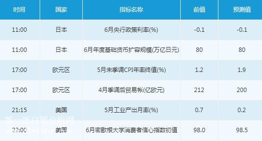周五(6月15日)亞盤時段,投資者需關(guān)注11:00公布的日本6月央行政策利率、日本6月年度基礎貨幣擴容規(guī)模。歐盤時段,關(guān)注17:00公布的歐元區(qū)5月未季調(diào)CPI年率終值、歐元區(qū)4月季調(diào)后貿(mào)易帳。