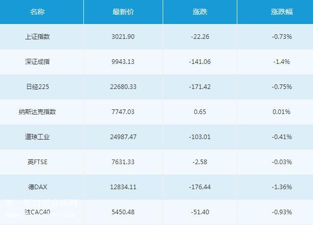 道瓊斯指數(shù)周一收盤(pán)下跌103.01點(diǎn),跌幅0.41%,報(bào)24987.47點(diǎn);標(biāo)普500指數(shù)周一收盤(pán)下跌5.55點(diǎn),跌幅0.2%,報(bào)2773.87點(diǎn);納斯達(dá)克指數(shù)周一收盤(pán)上漲0.65點(diǎn),漲幅0.01%,報(bào)7747.03點(diǎn)。