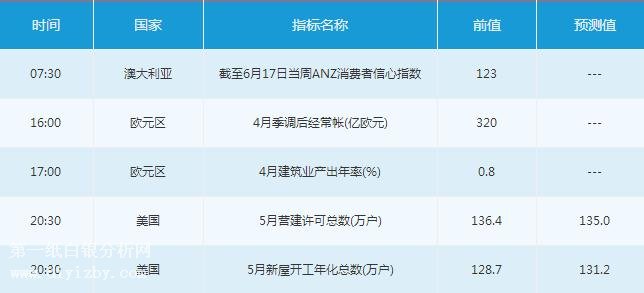 周二(6月19日)亞歐時段,投資者需關注07:30公布的澳大利亞截至6月17日當周ANZ消費者信心指數,關注16:00公布的歐元區4月季調后經常帳,及17:00的歐元區4月建筑業產出年率。