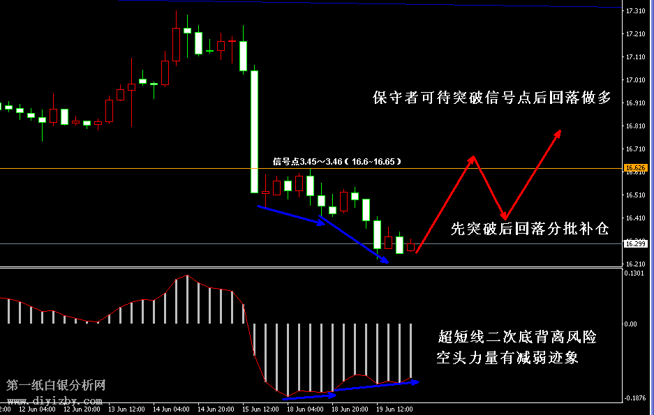今日下方關(guān)鍵支撐3.34~3.36(16.1~16.2)、3.32(16);今日上方關(guān)鍵阻3.48(16.75)、3.54~3.57(17.05~17.2)、3.6(17.35)。 提示:技術(shù)僅僅是基于概率論和統(tǒng)計(jì)學(xué)的一種綜合分析手段,絕非預(yù)測。所以技術(shù)分析是在考慮做好止損的情況下去博取大概率事件,投資不可過于迷信技術(shù)分析。(短線操作請一定做好止損,一旦被損,代表分析師基于概率和統(tǒng)計(jì)的技術(shù)分析不適用于當(dāng)前行情) 另外,由于紙白銀價(jià)格是國際銀價(jià)換算而來,而換算過程中涉及到人民幣對美元匯率的變化,即使在國際銀價(jià)不變化的情況下,如果人民幣貶值或升值,也會導(dǎo)致紙白銀價(jià)格出現(xiàn)變動。因此,我們的分析只采用最新的國際銀價(jià)對應(yīng)的人民幣白銀價(jià)格,如與過去分析價(jià)格有出入, 投資者應(yīng)知曉其原因。 1、文中價(jià)格為紙白銀價(jià)格,括號內(nèi)為國際銀價(jià),投資者可雙向參考。 2、以上所有價(jià)格為工商銀行買入價(jià),即紙白銀低價(jià)。進(jìn)倉點(diǎn)位要再加點(diǎn)差(各銀行點(diǎn)差不一),出倉則不要。 3、第一紙白銀給出的所有建議僅供投資者參考,不作為下單絕對依據(jù),切勿過于依賴。 4、北京時(shí)間09:00發(fā)布此文章。 5、上一交易日白銀價(jià)格分析情況:(6月19日)白銀震蕩區(qū)間來回波動 超跌后將尋求反彈